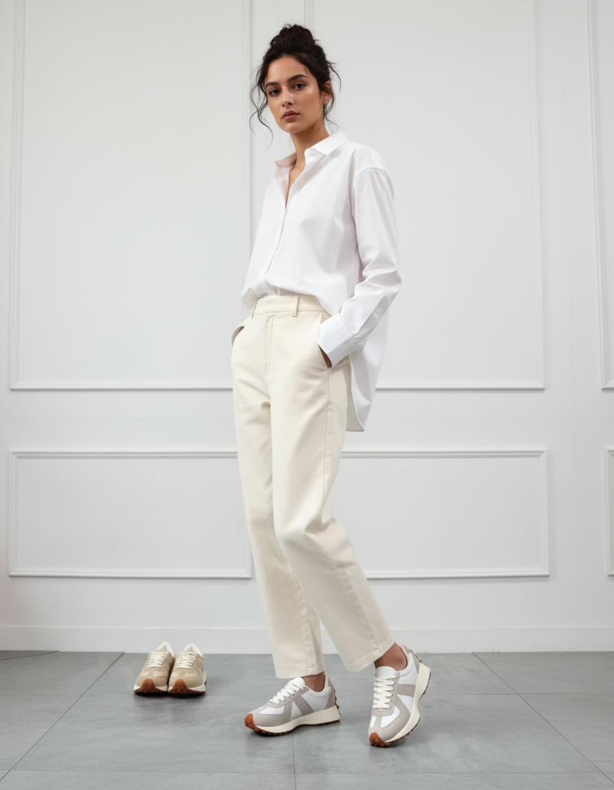 These Domestic Waffle Run sneakers feature a stylish and classic athletic silhouette, highlighted by a distinctive gum-colored waffle traction outsole. The upper is constructed from premium artificial leather, providing a clean, multi-paneled aesthetic that balances durability with a lightweight feel. Perfect for daily casual wear, these shoes offer a comfortable fit and a versatile look in neutral White and Beige tones. Proudly made in South Korea, they combine quality craftsmanship with a modern urban design.