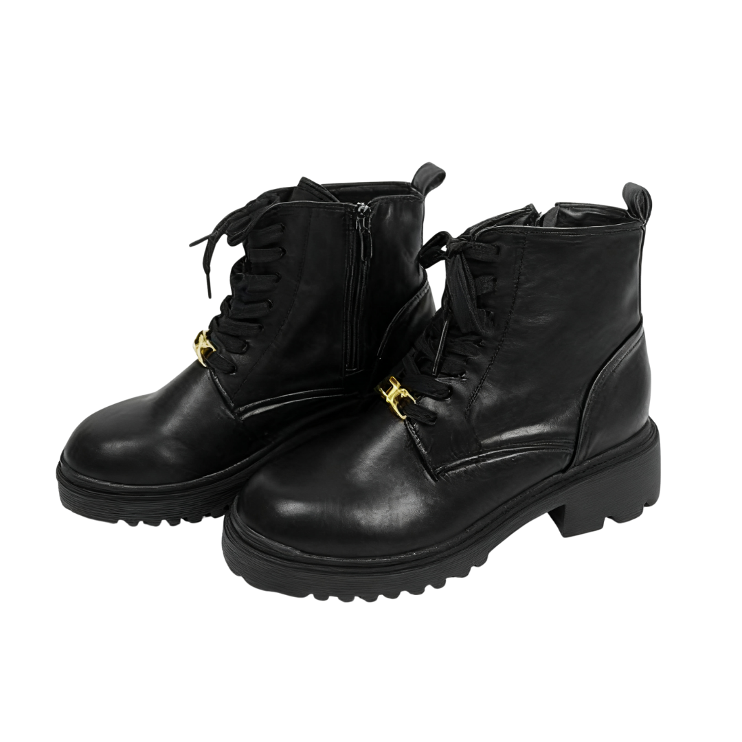 Crafted from textured glossy leather, these boots boast a lustrous finish and a sophisticated aesthetic. The classic lace-up design and delicate gold metal buckle add a stylish touch to the casual boot silhouette, creating a subtle yet thoughtful design.