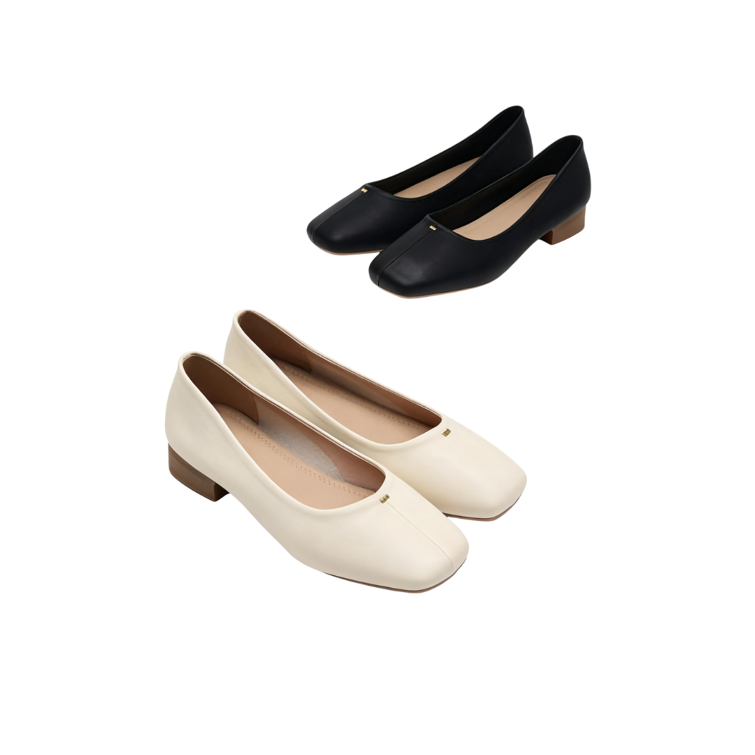 Designed with a simple and elegant square-toed, shallow-cut shape, these shoes boast clean, sleek lines that flatter the foot and create a sense of lightness and style. The upper is crafted from a finely textured material (exuding a smooth leather-like feel and visual quality), and small metal accents accent the toe, adding refined detail and a subtle, elevated feel. Paired with a stable and comfortable low-heeled heel, these shoes offer both stylish performance and a comfortable, comfortable fit, making them less tiring to wear even after extended periods. Available in elegant off-white and classic black, these Korean square-toed, shallow-cut, low-heeled shoes are a practical and versatile choice for everyday wear, whether paired with a skirt for a feminine look or paired with pants for a sleek commuting look.