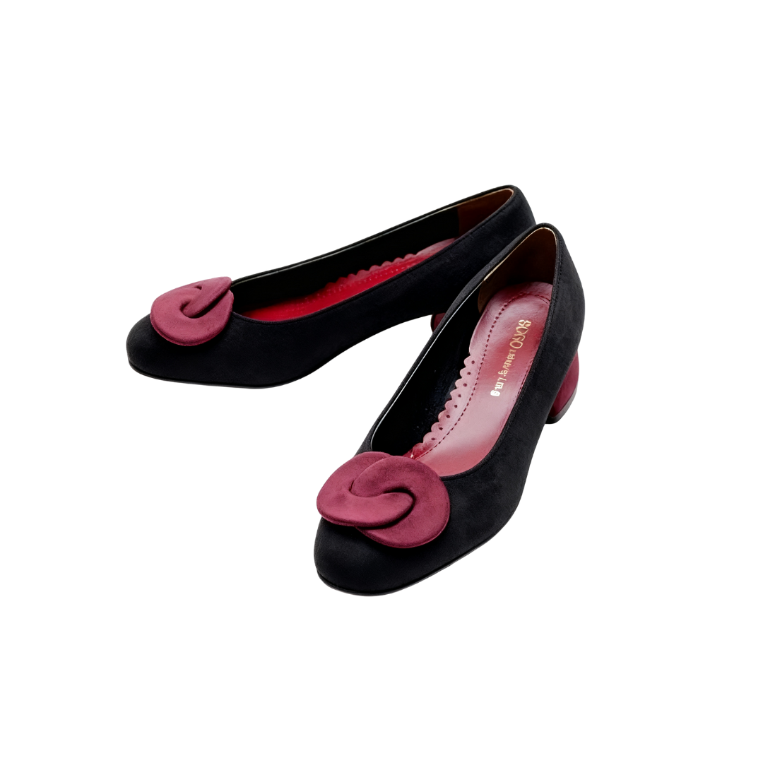 The upper is made of suede, which has a soft texture and a delicate touch. The shoe body is based on a classic black color, with a three-dimensional bow decoration on the toe, available in two color options: blue and red, adding a lively and exquisite atmosphere to the overall look. The shoe shape features a comfortable shallow mouth design, paired with a stable and easy-to-walk medium-thick heel, balancing fashionable styling and walking experience. Details such as the serrated stitching on the inner side of the shoe not only enhance the texture but also make the foot feel more fitting and comfortable. Whether for daily commuting or matching with skirts to create an elegant style, it can be easily handled. It is a Korean-style shoe that combines design sense and practicality.