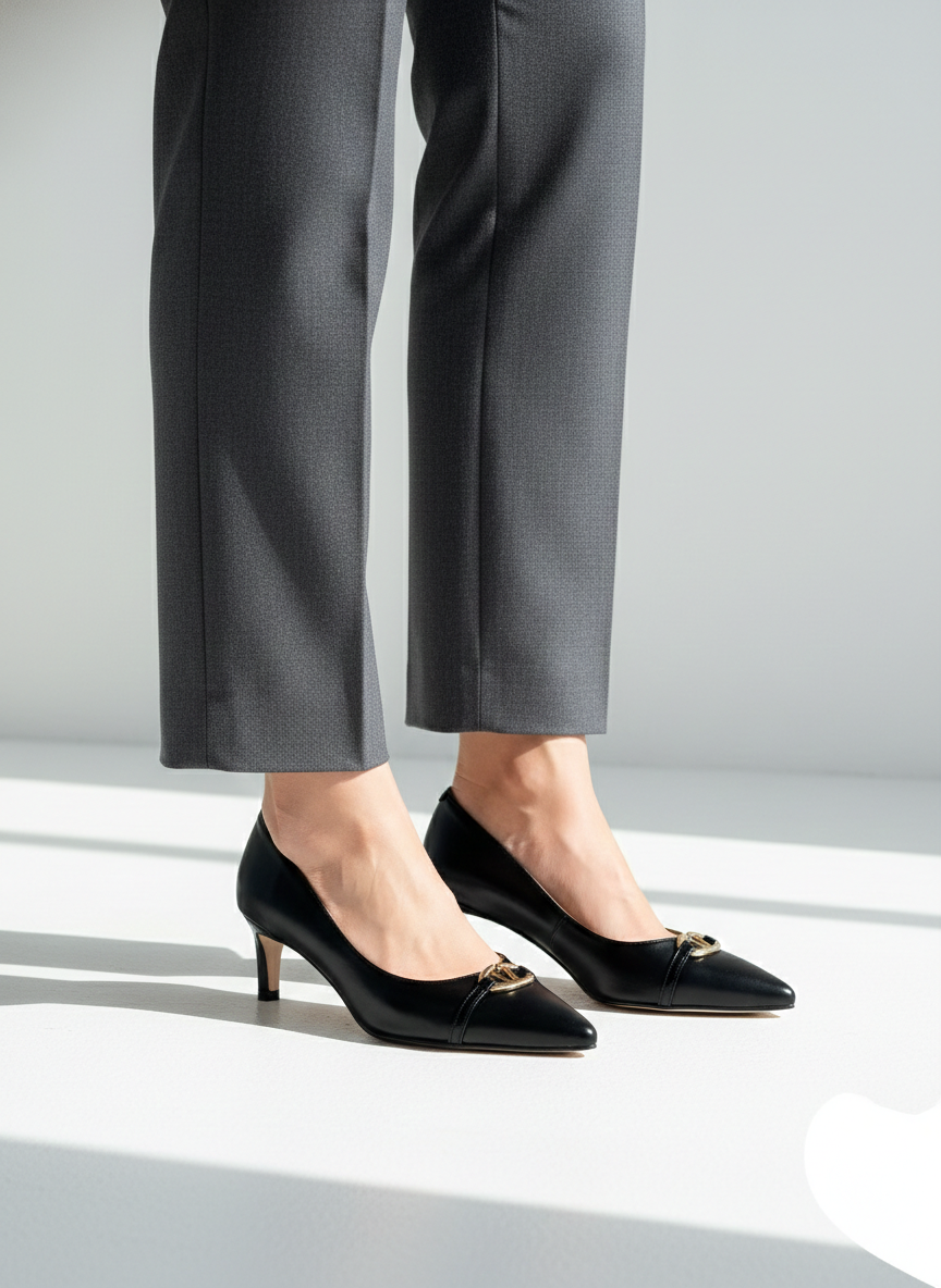 These elegant pointed-toe pumps feature a sophisticated metal buckle detail on the vamp, adding a touch of modern luxury to a classic silhouette. Crafted in South Korea with high-quality synthetic leather, these shoes offer a sleek and polished look suitable for both professional office wear and formal evening occasions. The low heel design ensures comfort for all-day wear while maintaining a graceful aesthetic. Available in versatile shades including Black, Charcoal, and Multi-tones.