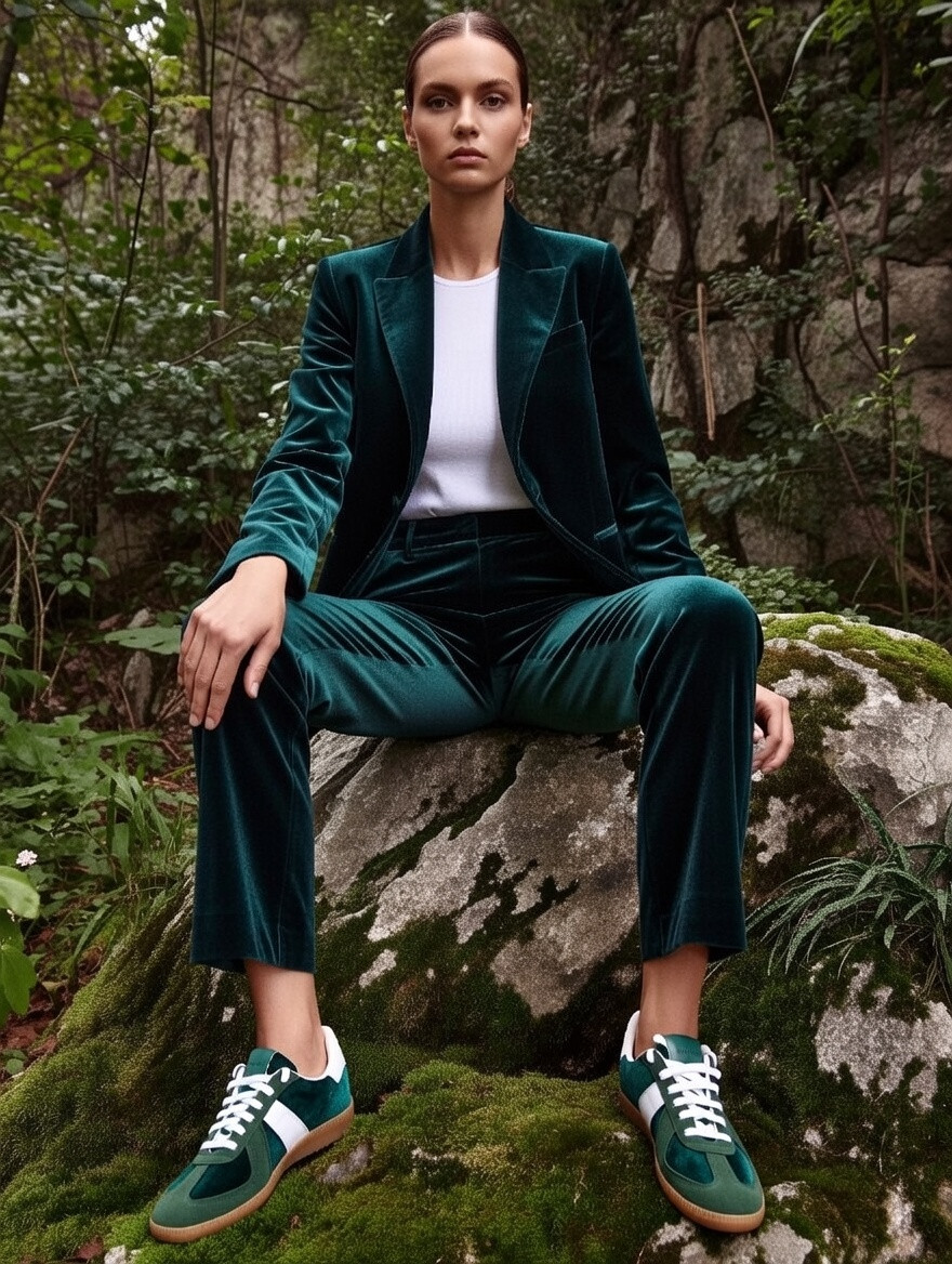 These sneakers feature a classic German Army Trainer (GAT) silhouette, reimagined with a luxurious dark green velvet upper and premium leather overlays. Designed for both men and women, they offer a vintage athletic aesthetic with a durable gum rubber sole and high-quality handmade construction. The interior is lined for comfort, making them suitable for everyday wear.