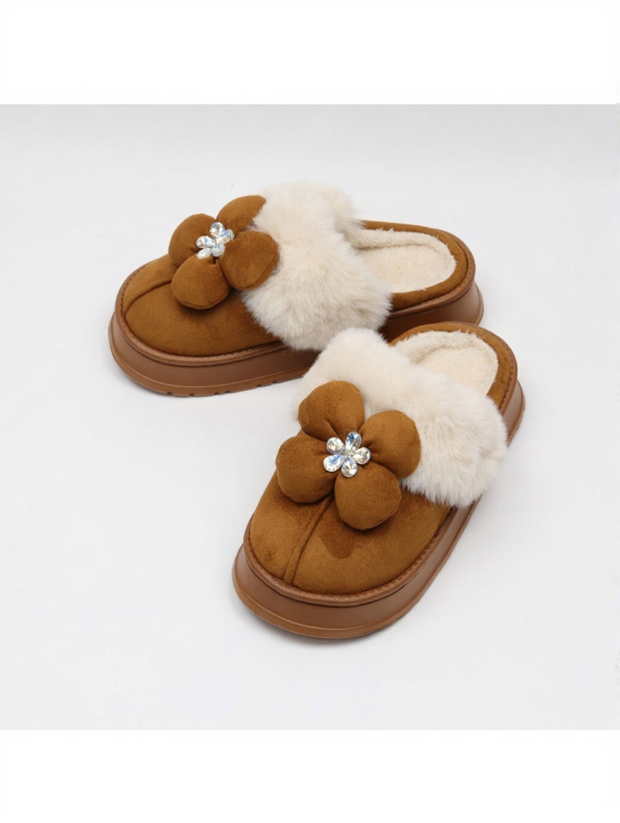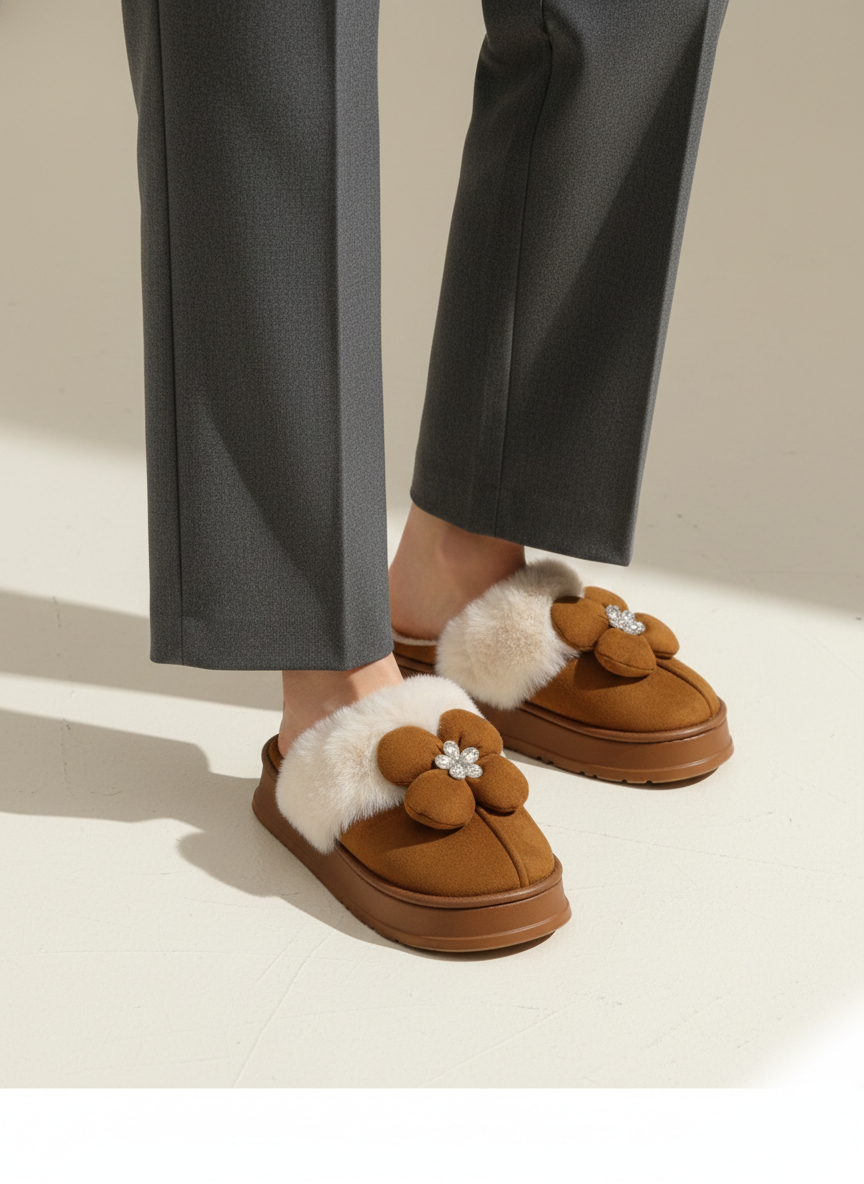These stylish Ugg-style slippers feature a 4cm height-increasing platform for a subtle lift while maintaining a lightweight feel. The exterior is crafted from soft suede and accented with a charming fluffy flower decoration featuring a crystal center. Designed for comfort and warmth, the interior is lined with plush faux fur, making them ideal for winter wear. High-quality construction made in South Korea.