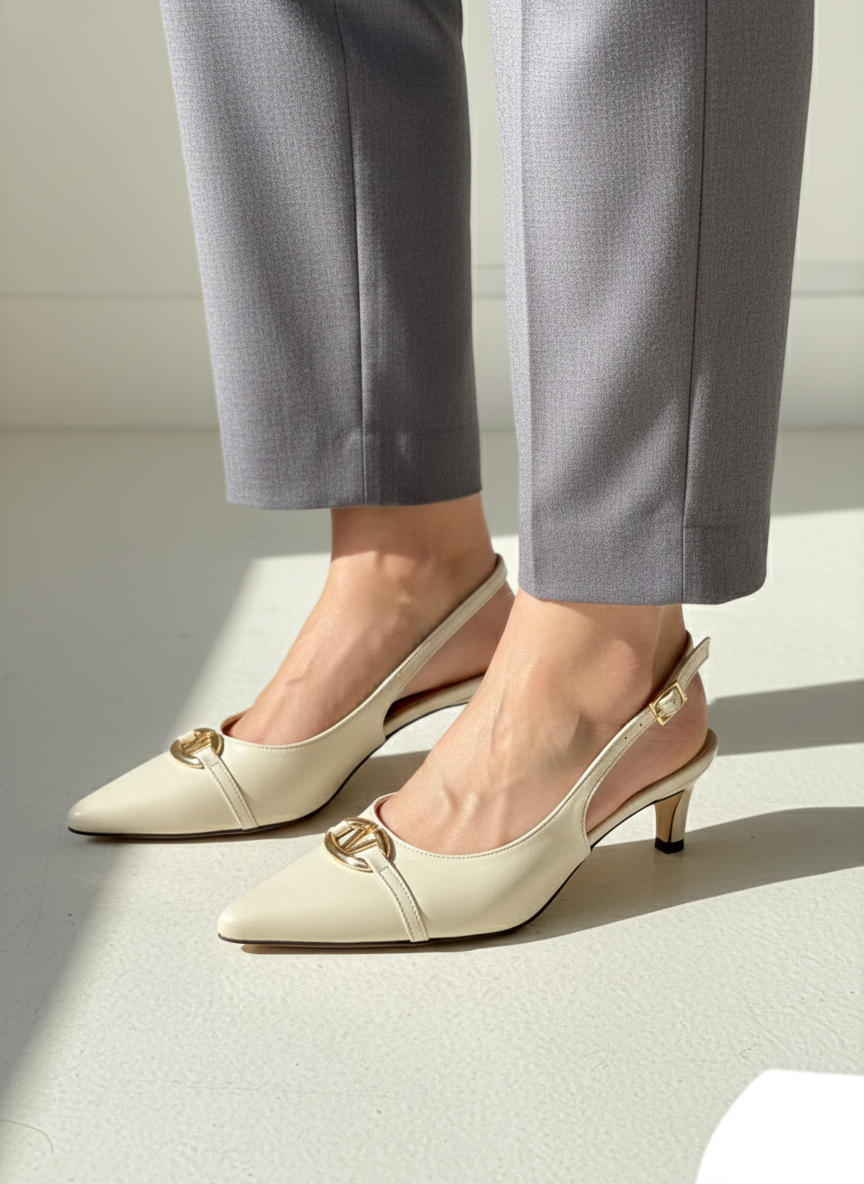These elegant back-open heels feature a sleek, pointed-toe design complemented by a sophisticated gold-tone metal buckle detail on the vamp. Designed for both style and comfort, they include a secure slingback strap with an adjustable buckle for a perfect fit. The moderate heel height makes them ideal for professional settings, formal events, or elevating a casual chic look. Crafted from high-quality synthetic leather, these shoes offer a polished finish and are available in versatile tones including cream, black, charcoal, and multi-color options.