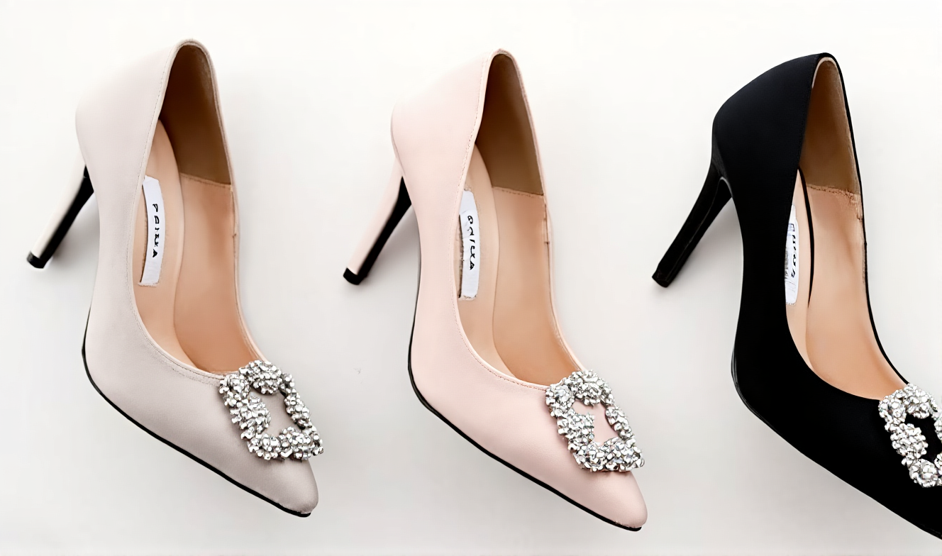 These elegant high-heel pumps feature a sophisticated 9cm stiletto heel and a pointed toe design. The highlight of the shoe is the exquisite rectangular jewel buckle embellishment on the toe, adding a touch of luxury and sparkle. Crafted in South Korea from high-quality synthetic leather, these pumps offer a refined finish suitable for formal occasions, weddings, or professional office wear. The collection comes in a versatile range of colors including Beige, Light Khaki, Black, Melange White, Melange Gray, and Navy, allowing for easy pairing with various outfits.