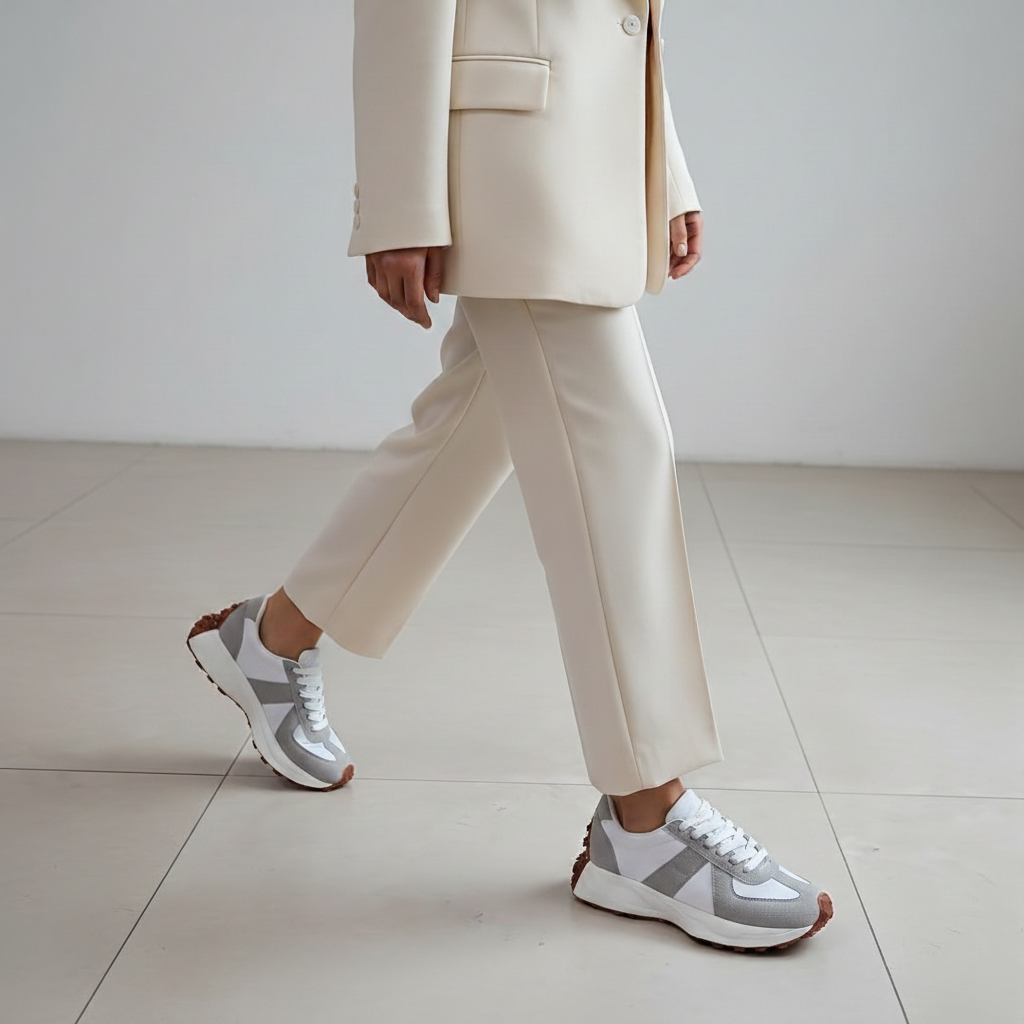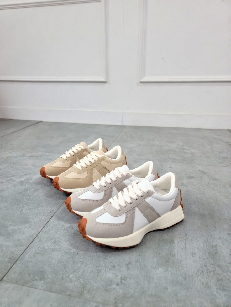 These Domestic Waffle Run sneakers feature a stylish and classic athletic silhouette, highlighted by a distinctive gum-colored waffle traction outsole. The upper is constructed from premium artificial leather, providing a clean, multi-paneled aesthetic that balances durability with a lightweight feel. Perfect for daily casual wear, these shoes offer a comfortable fit and a versatile look in neutral White and Beige tones. Proudly made in South Korea, they combine quality craftsmanship with a modern urban design.