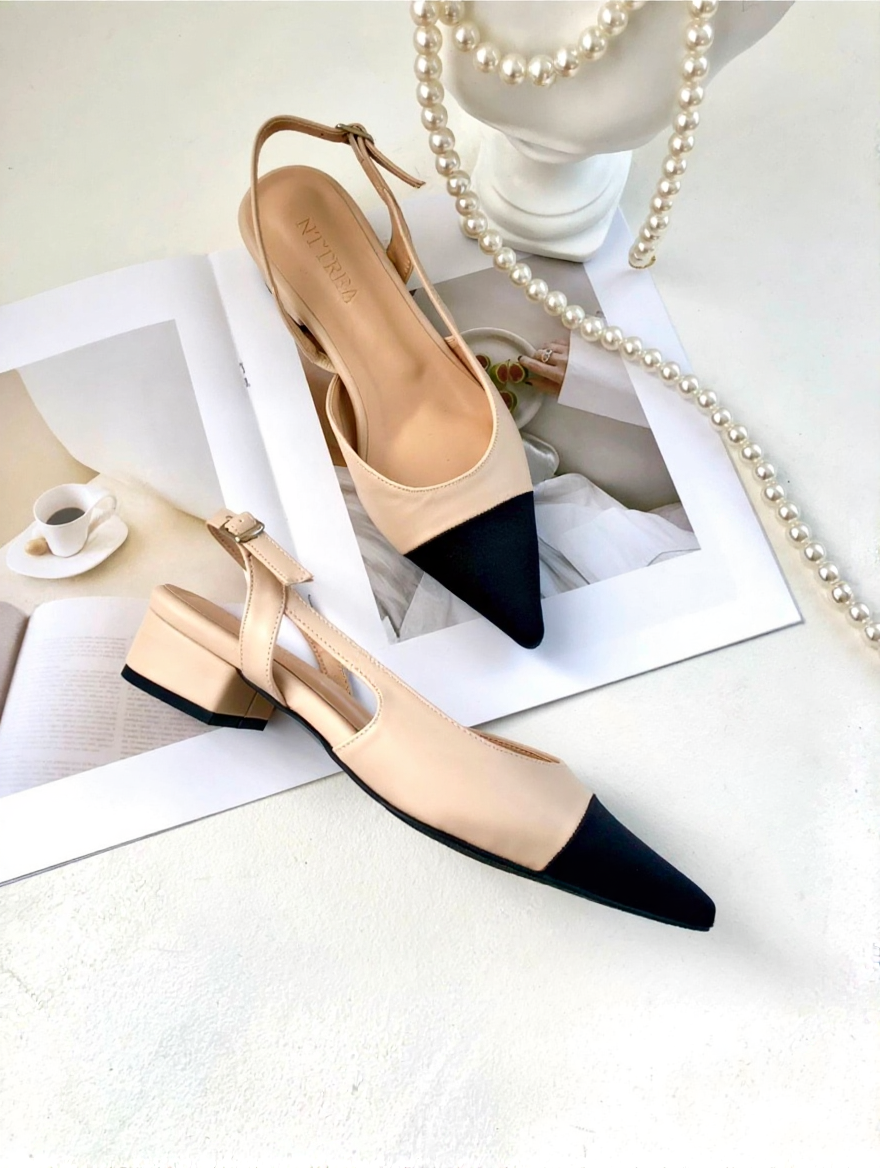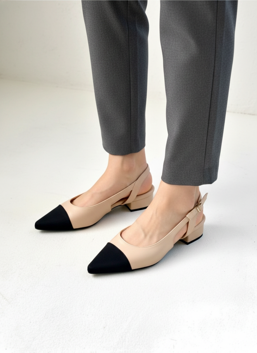 These stylish and versatile slingback flats are domestically made in South Korea, offering a perfect blend of comfort and professional elegance. Featuring a sophisticated color-block design with a contrasting toe cap, these shoes are ideal for daily wear, formal office settings, or job interviews. The moderate 3cm heel provides a subtle lift while ensuring all-day comfort. Crafted from high-quality artificial leather, the design includes a secure slingback strap and a sleek pointed toe for a refined silhouette.