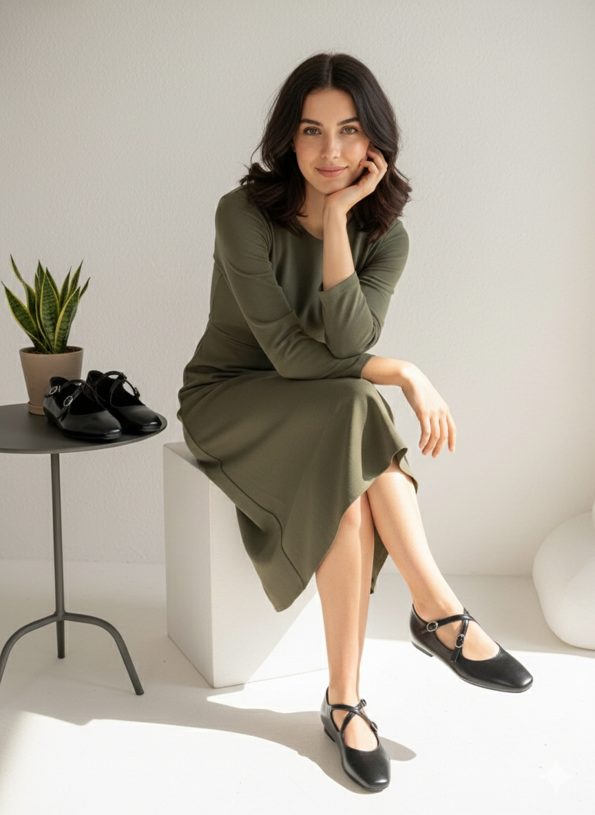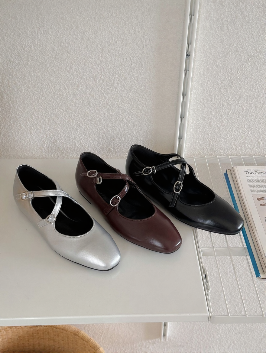 These elegant Mary Jane flats feature a unique double cross-strap design with delicate buckle detailing. Crafted from premium synthetic leather with a smooth matte finish, they offer a sophisticated and versatile look suitable for both casual and formal outfits. The rounded toe provides a comfortable fit, while the flat sole ensures ease of movement for all-day wear. Available in classic Black, Silver, and Brown to complement any wardrobe.