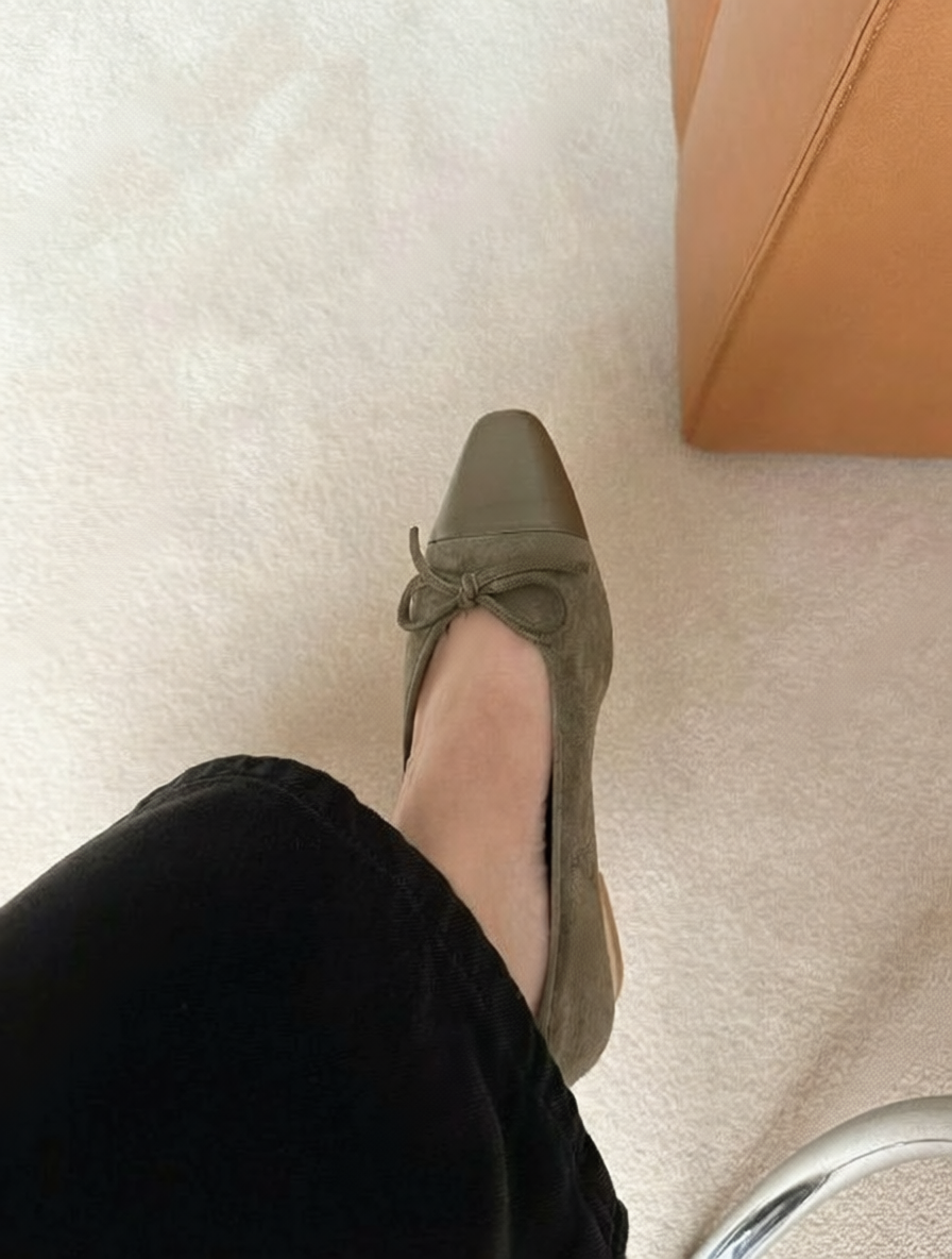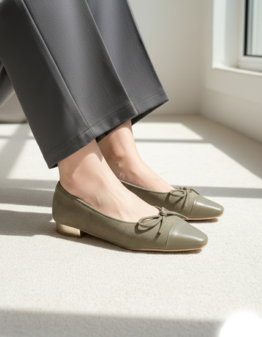 These elegant pointed-toe flats are crafted from 100% premium lambskin, offering a buttery-smooth texture and exceptional comfort. The design features a delicate ribbon bow detail at the front, adding a touch of feminine sophistication to the classic khaki silhouette. Known for its lightweight and breathable properties, the high-quality lambskin ensures a soft fit that conforms to your foot. Perfect for both professional settings and casual outings, these shoes combine luxury material with a timeless aesthetic.