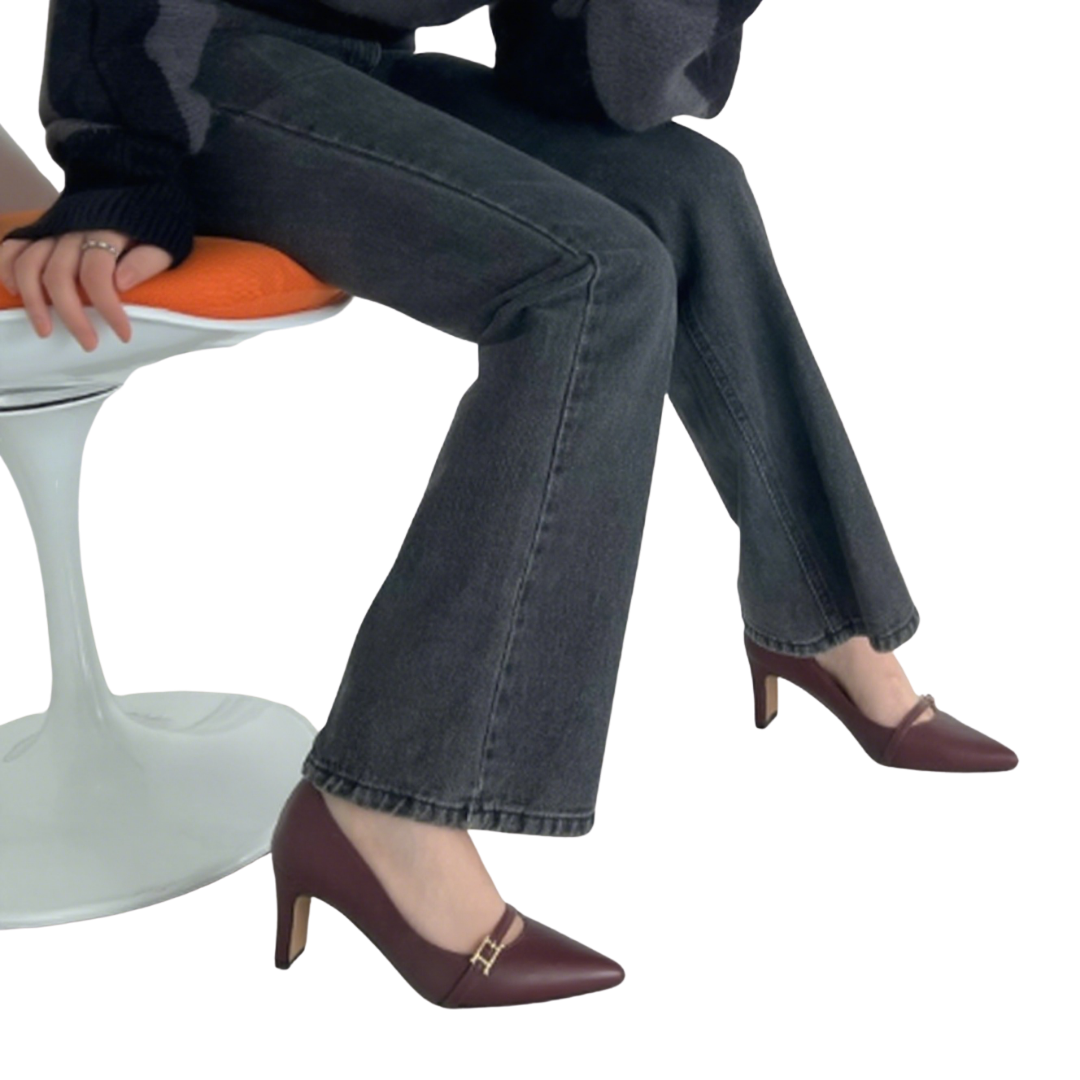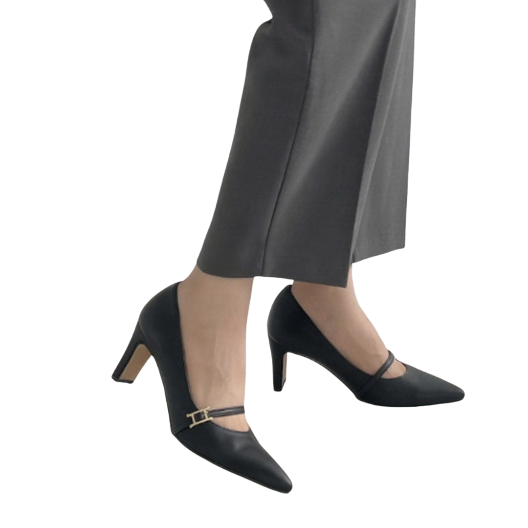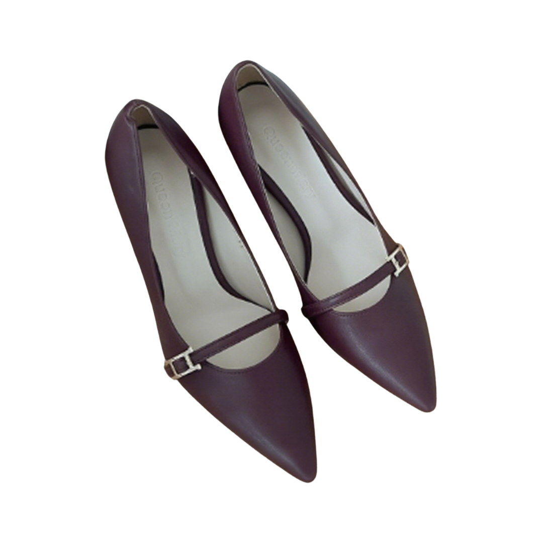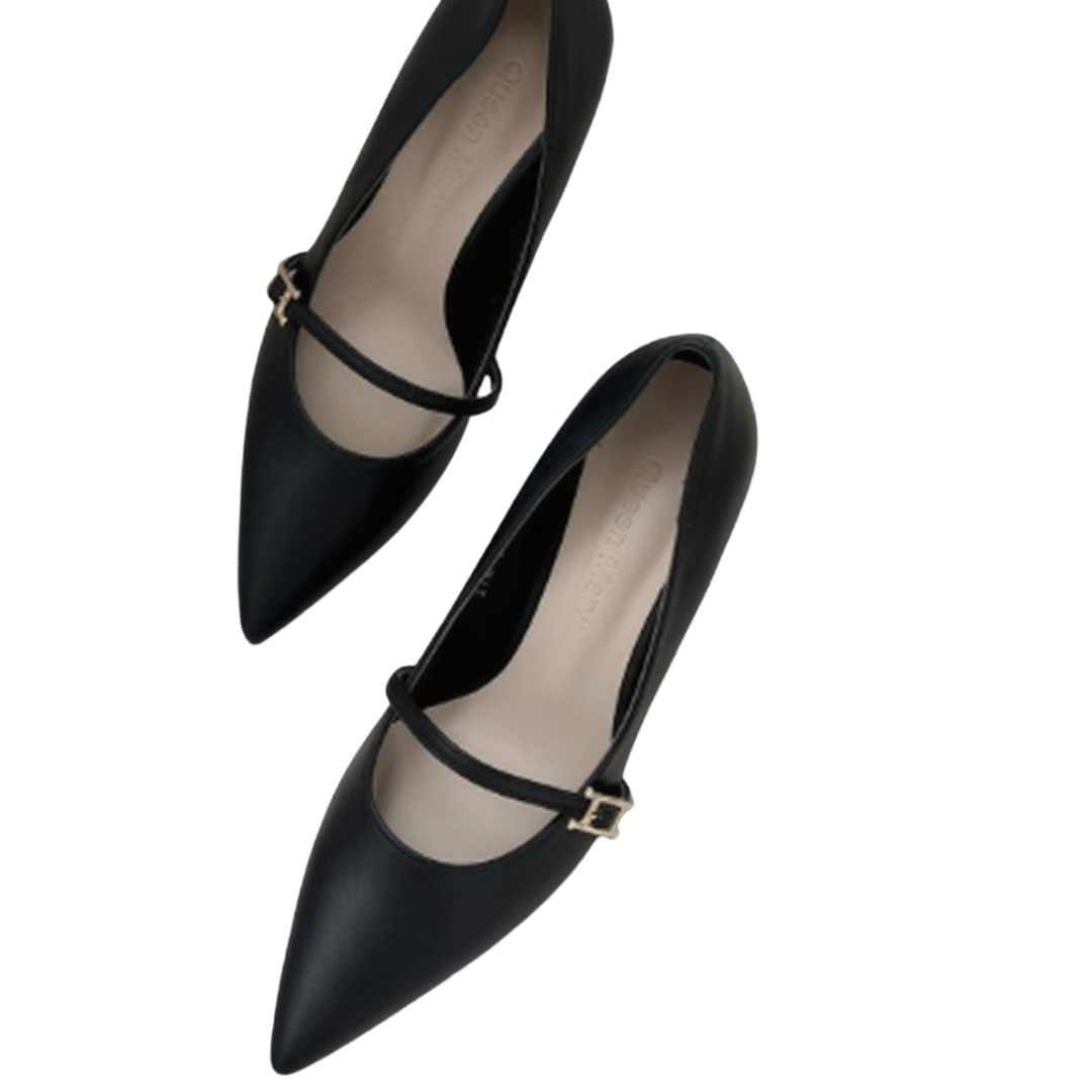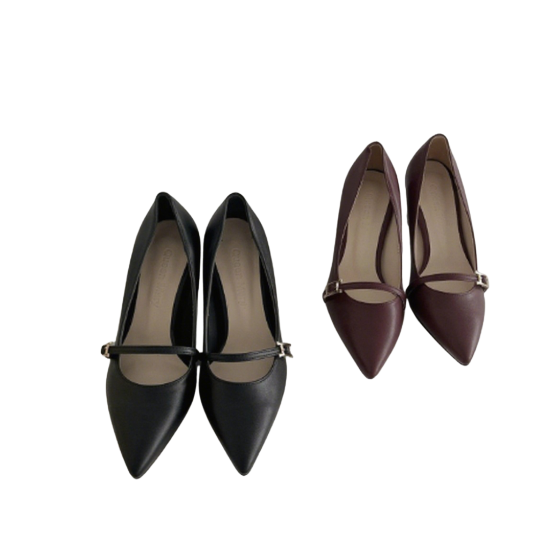 These Korean-made, pointed-toe Mary Jane pumps feature a faux leather upper and are available in classic black or premium burgundy. The sharp, pointed toe design flatters the foot's shape, creating an elegant look. The single-strap ankle strap, adorned with a metal square buckle, adds refined detailing and a vintage touch. The stiletto heel, approximately 7cm high, offers both stability and style, perfect for any formal occasion. The soft fiber lining enhances comfort. The lightweight rubber sole ensures a smooth ride. Available in sizes from 220mm to 260mm, these pumps effortlessly create an elegant, sophisticated look with suits, dresses, and jeans, making them an ideal choice for office, party, or everyday wear.