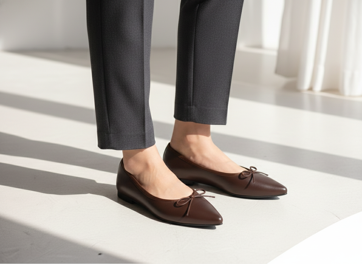 These elegant Korean handmade flat shoes are crafted from high-quality cowhide leather, offering both durability and a premium feel. Featuring a sophisticated pointed toe design and a delicate ribbon detail, these 1cm low-heel flats provide a perfect blend of comfort and style for daily wear. Available in versatile colors including Black, Light Beige, Gray, and Brown, they are designed to complement any professional or casual outfit.