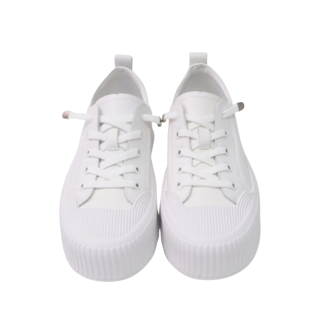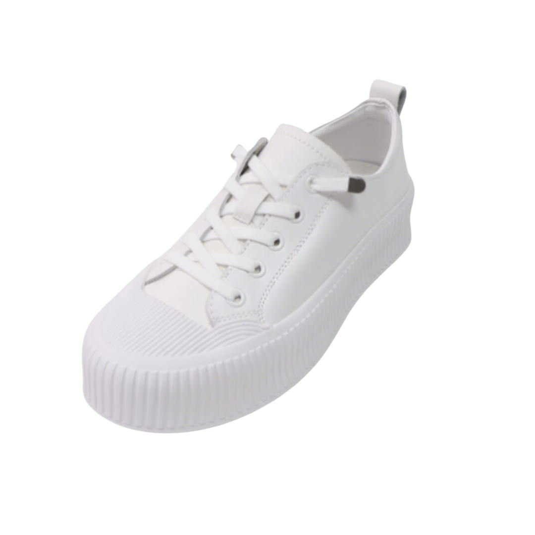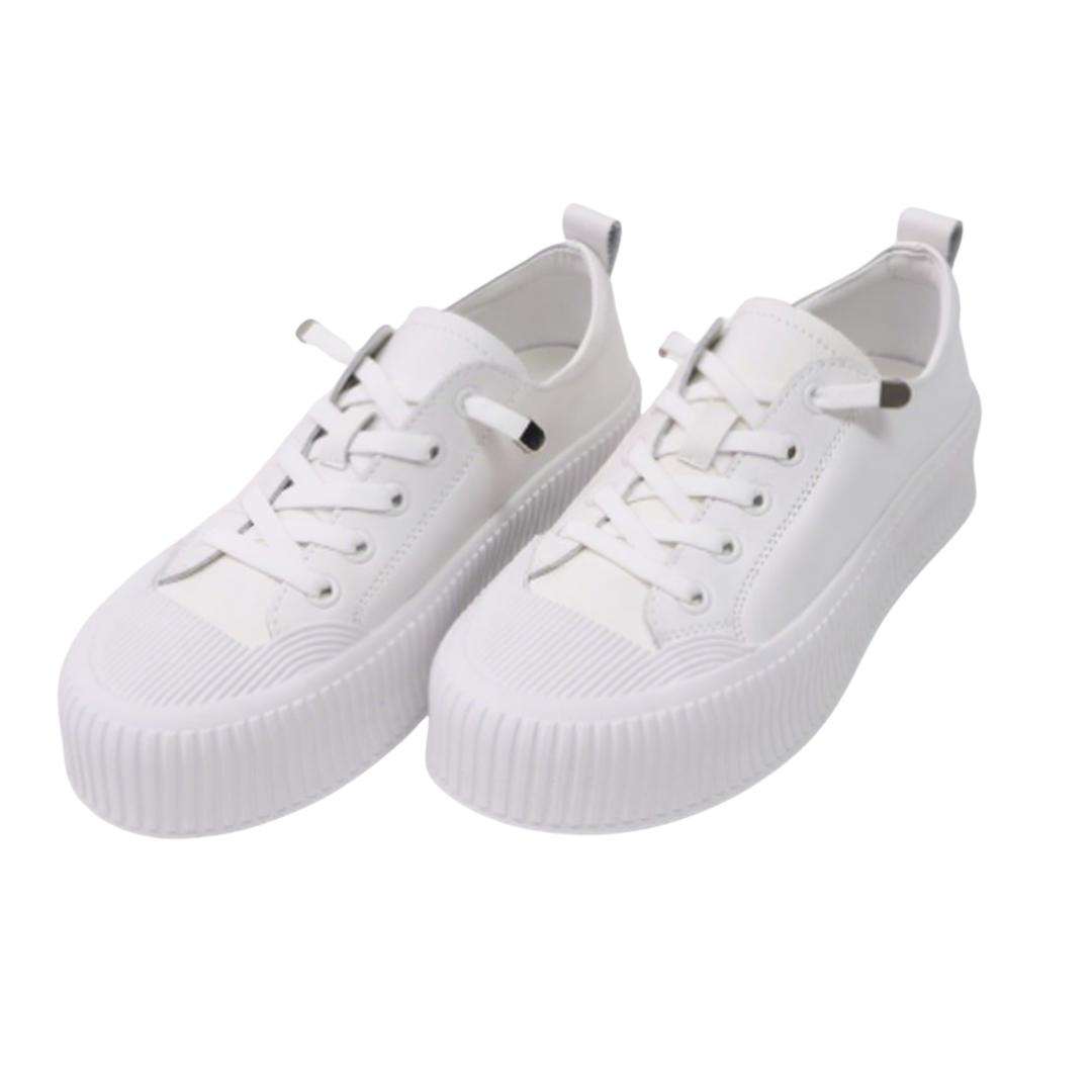 These Korean-made genuine leather platform sneakers feature a natural cowhide upper for a refined and durable feel. The pure white design is simple and versatile, with a woven toe cap adding a layered touch. The classic lacing system with metal eyelets ensures easy on and off, yet provides a secure fit. The 4cm platform provides a lightweight, height-enhancing effect while reducing walking pressure, making them ideal for both daily commuting and casual wear. The breathable pigskin lining ensures comfortable, long-lasting wear. The rubber wavy sole provides excellent grip and a non-slip feel for enhanced safety. Available in sizes 230-250mm, these shoes easily create a casual yet stylish look with jeans, sweatpants, or skirts, making them a comfortable and trendy everyday essential.