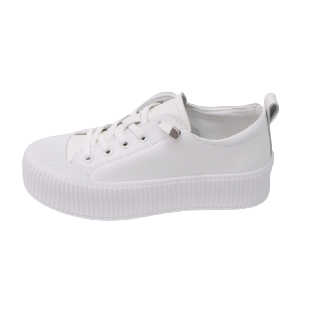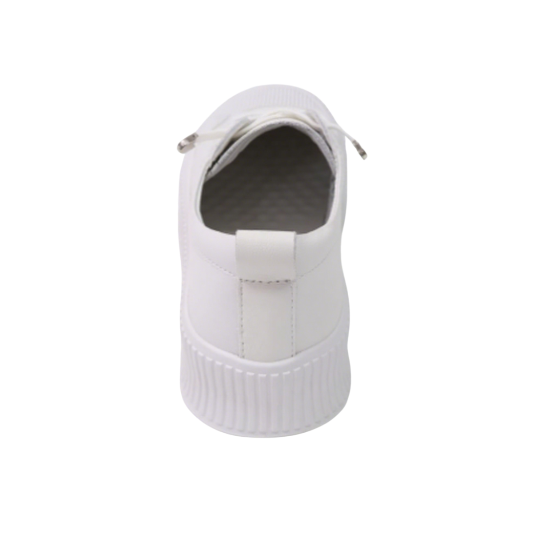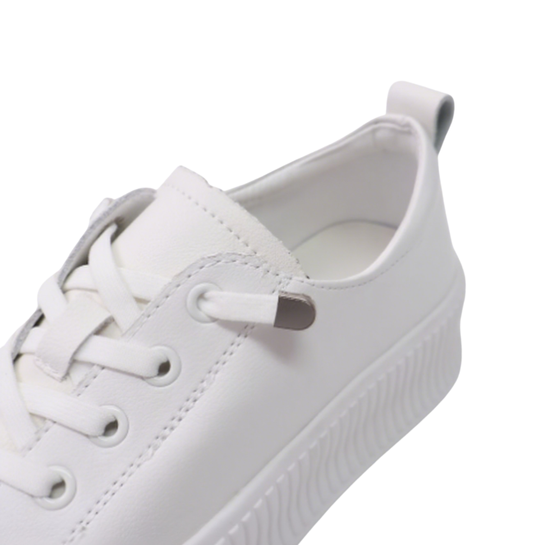 These Korean-made genuine leather platform sneakers feature a natural cowhide upper for a refined and durable feel. The pure white design is simple and versatile, with a woven toe cap adding a layered touch. The classic lacing system with metal eyelets ensures easy on and off, yet provides a secure fit. The 4cm platform provides a lightweight, height-enhancing effect while reducing walking pressure, making them ideal for both daily commuting and casual wear. The breathable pigskin lining ensures comfortable, long-lasting wear. The rubber wavy sole provides excellent grip and a non-slip feel for enhanced safety. Available in sizes 230-250mm, these shoes easily create a casual yet stylish look with jeans, sweatpants, or skirts, making them a comfortable and trendy everyday essential.
