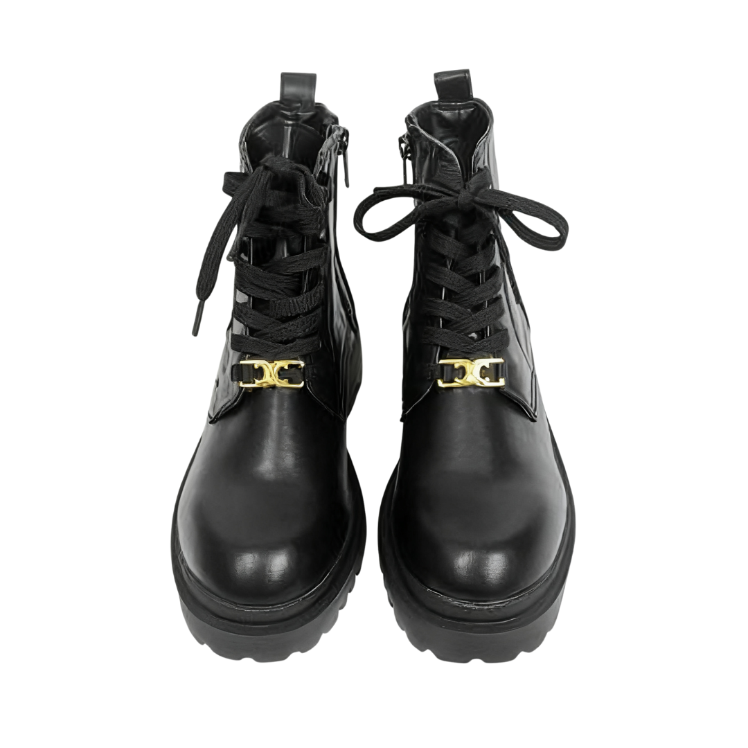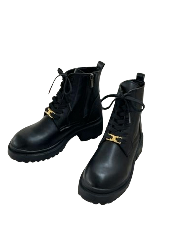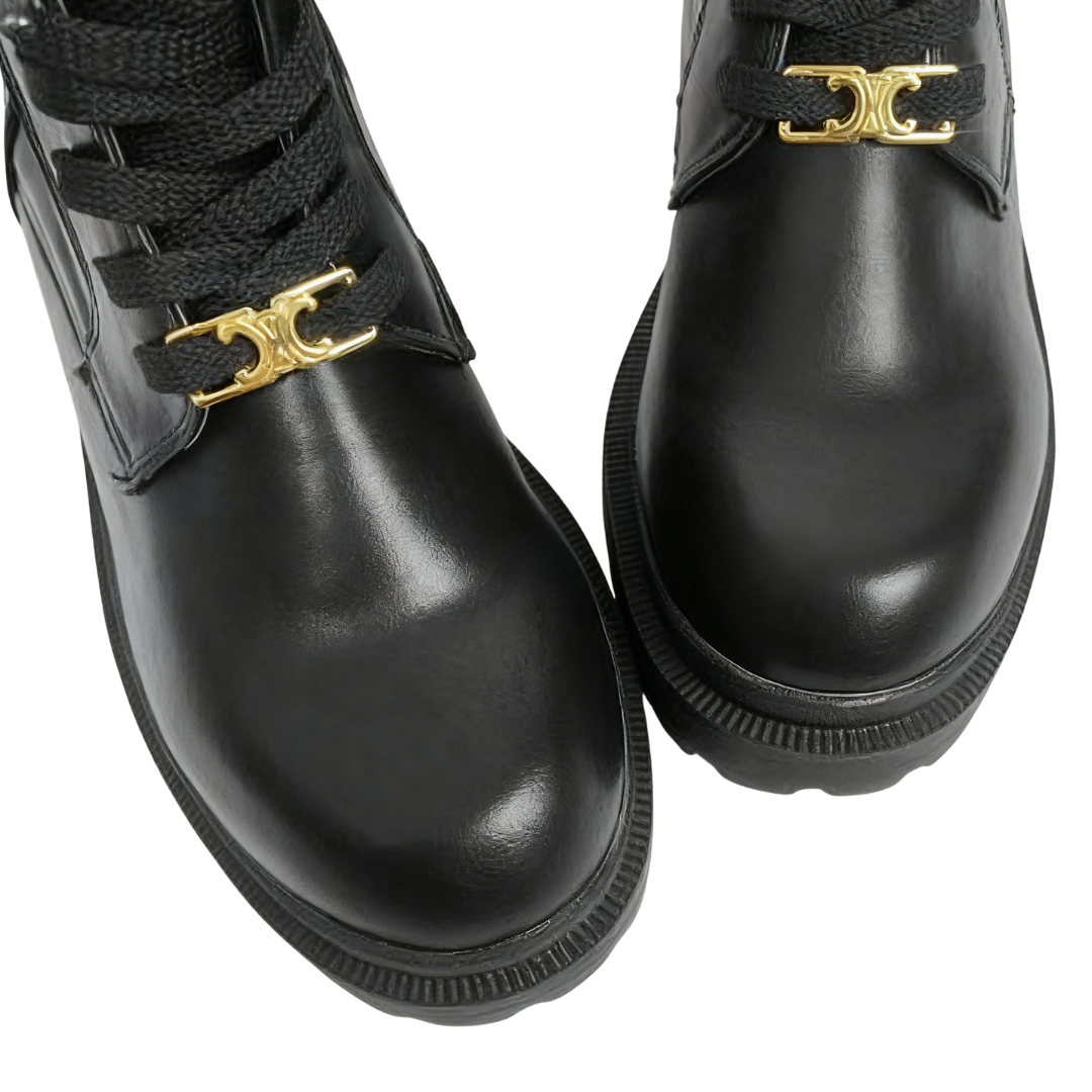 Crafted from textured glossy leather, these boots boast a lustrous finish and a sophisticated aesthetic. The classic lace-up design and delicate gold metal buckle add a stylish touch to the casual boot silhouette, creating a subtle yet thoughtful design.