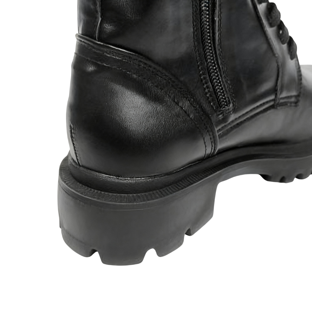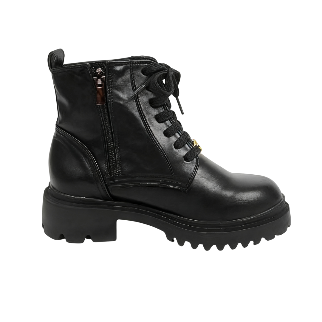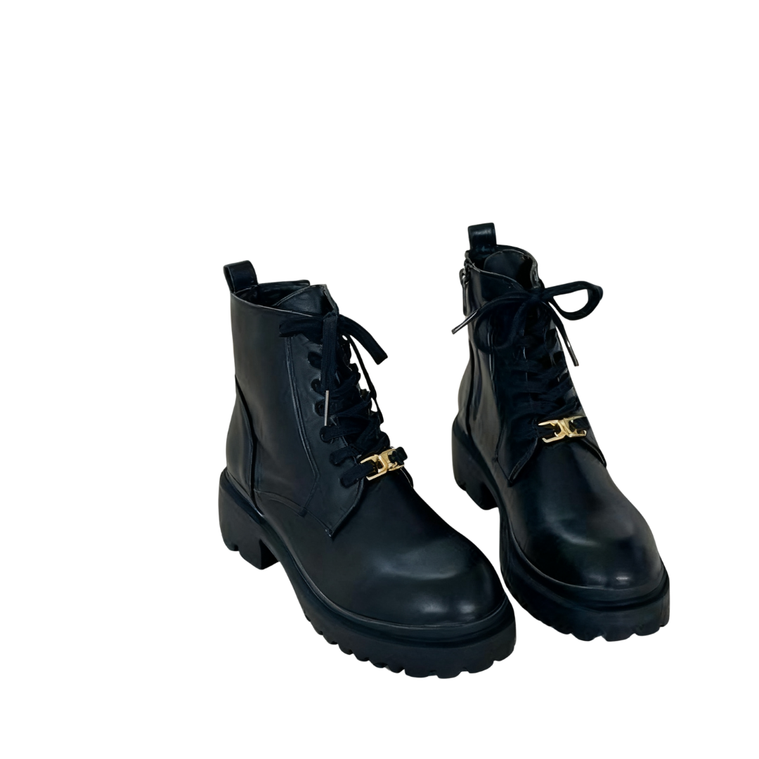 Crafted from textured glossy leather, these boots boast a lustrous finish and a sophisticated aesthetic. The classic lace-up design and delicate gold metal buckle add a stylish touch to the casual boot silhouette, creating a subtle yet thoughtful design.