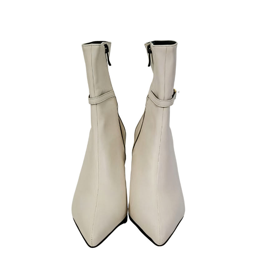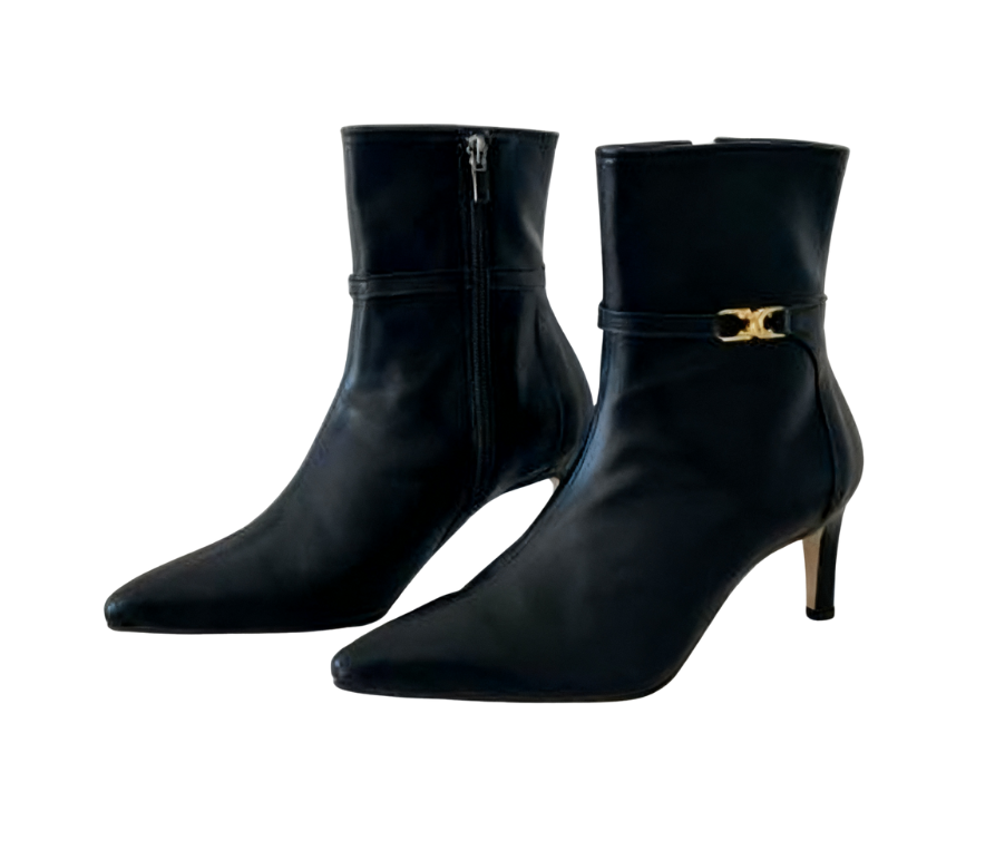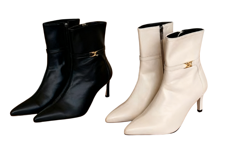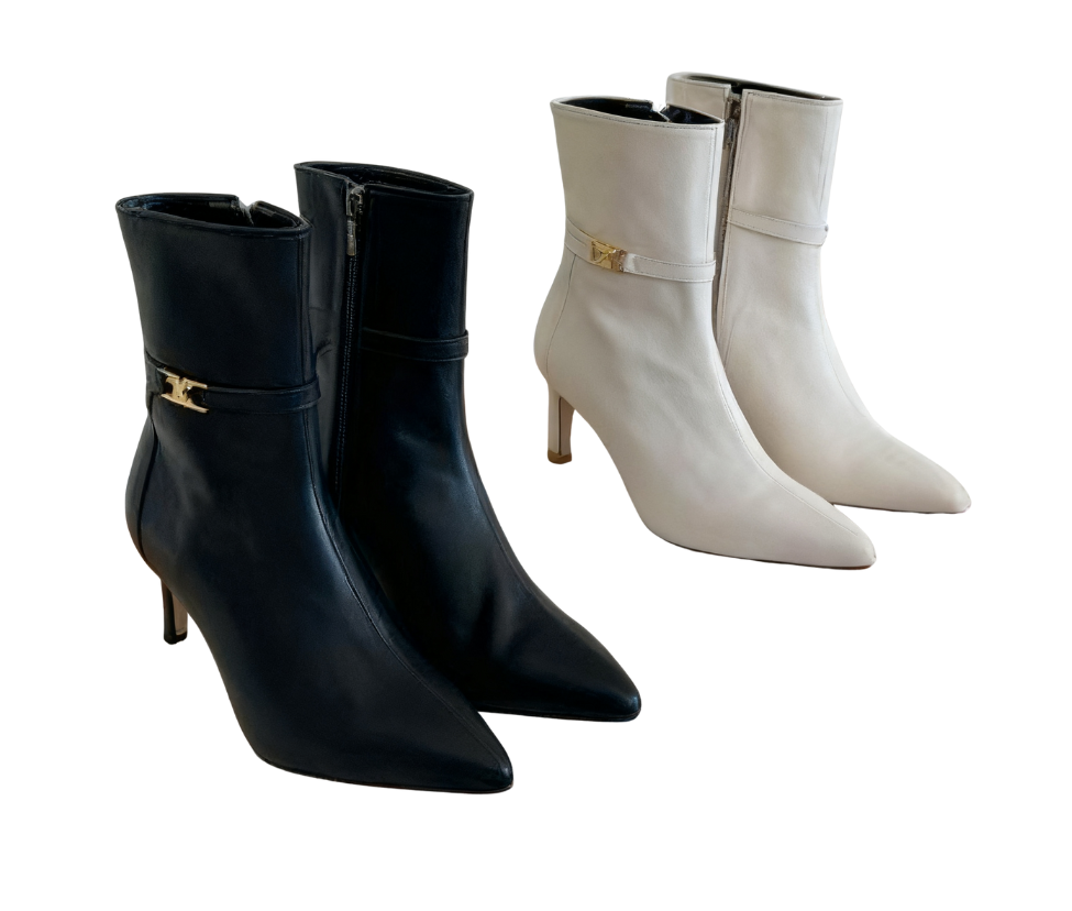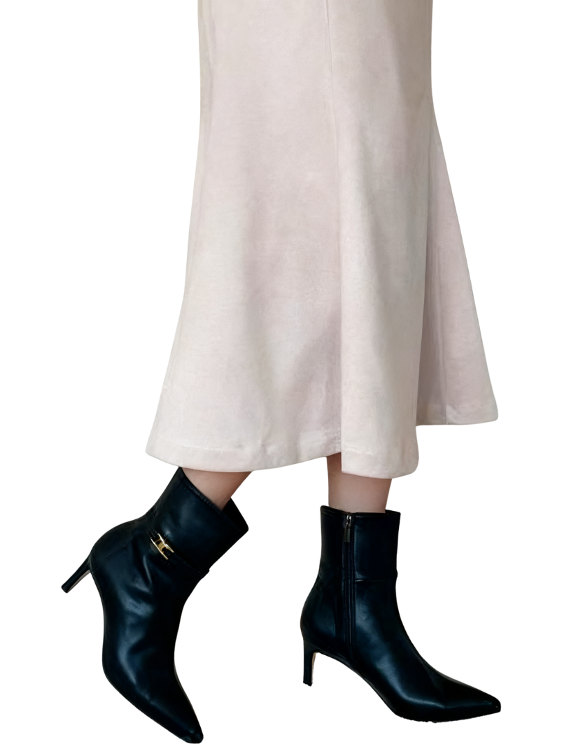 Exuding an elegant aura through exquisite craftsmanship~ The shoe body is made of high-quality leather, with a soft luster and smooth touch; the pointed-toe design修饰 the foot shape, instantly elongating the leg lines; the stiletto heel design combines stability and lightness, making every step more charming and alluring. The side of the shoe is adorned with delicate metal accessories, adding a fashionable highlight to the simple boot style, with perfect attention to detail~