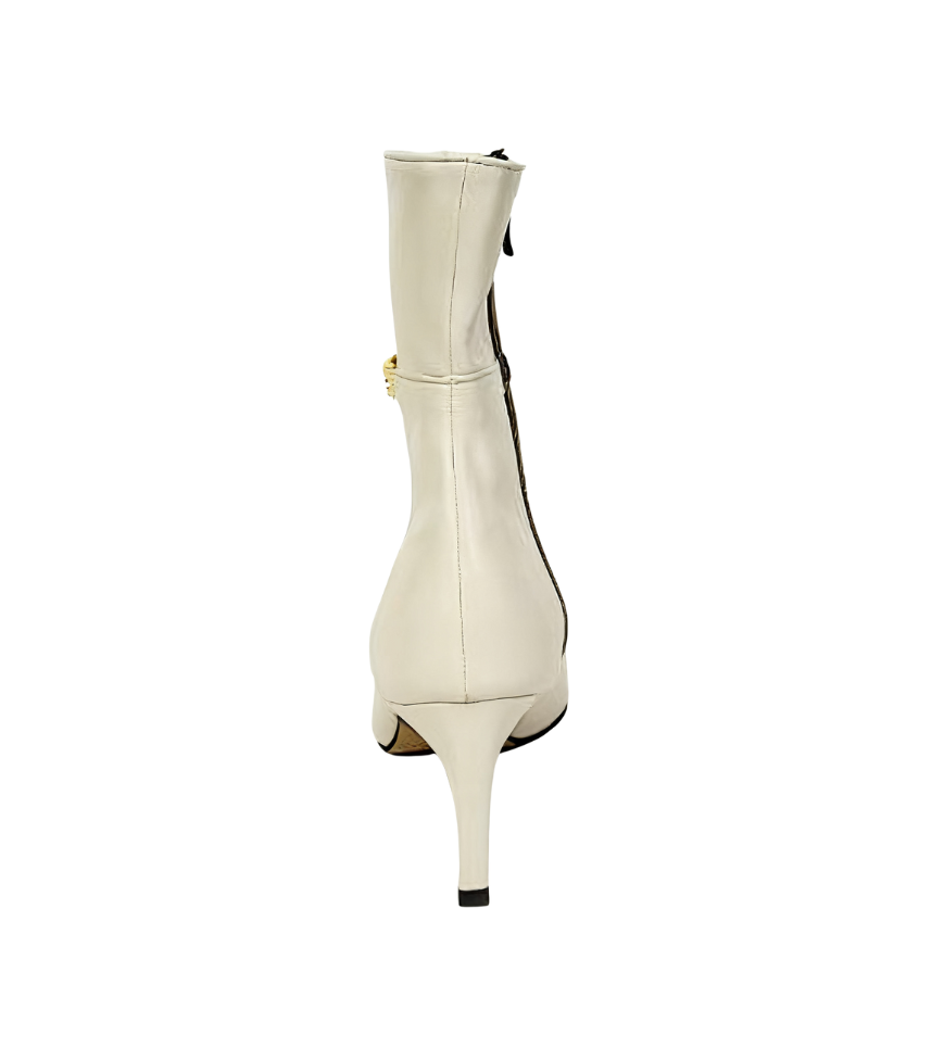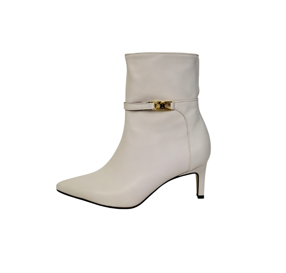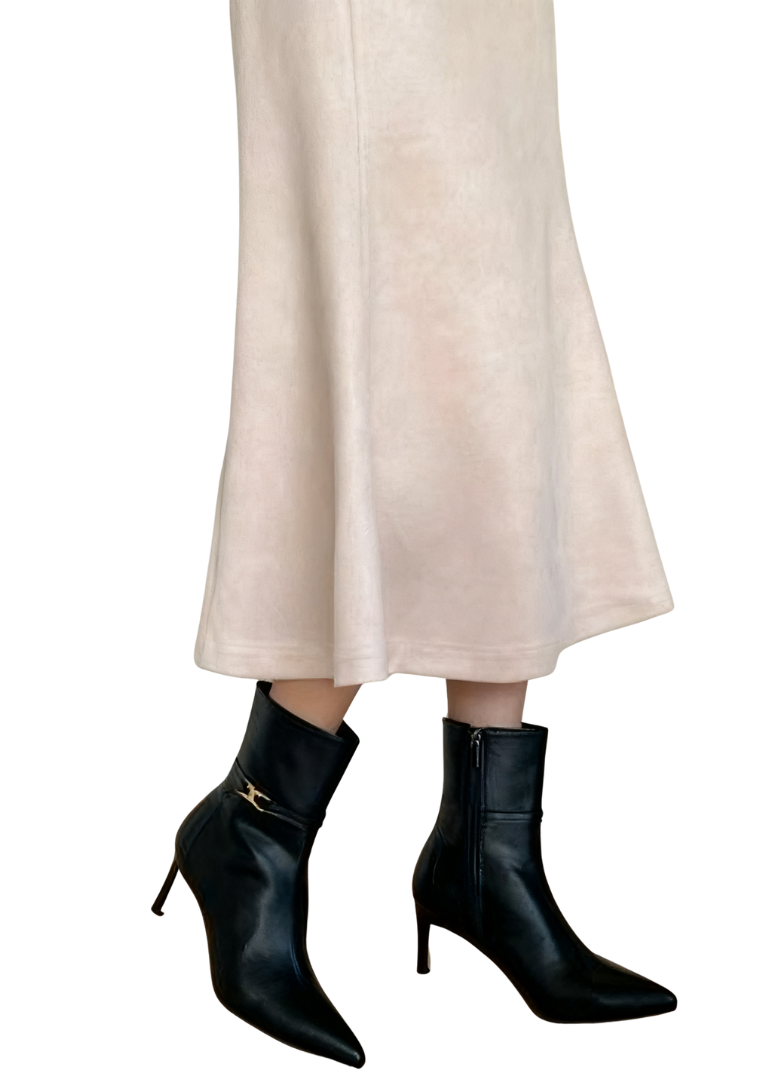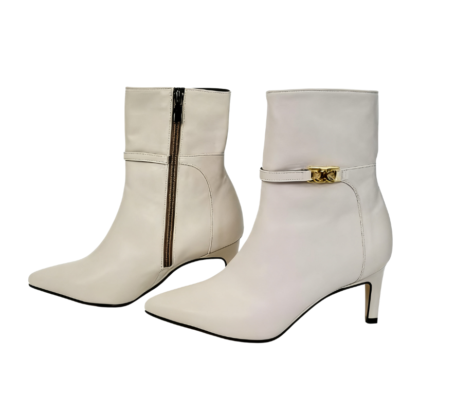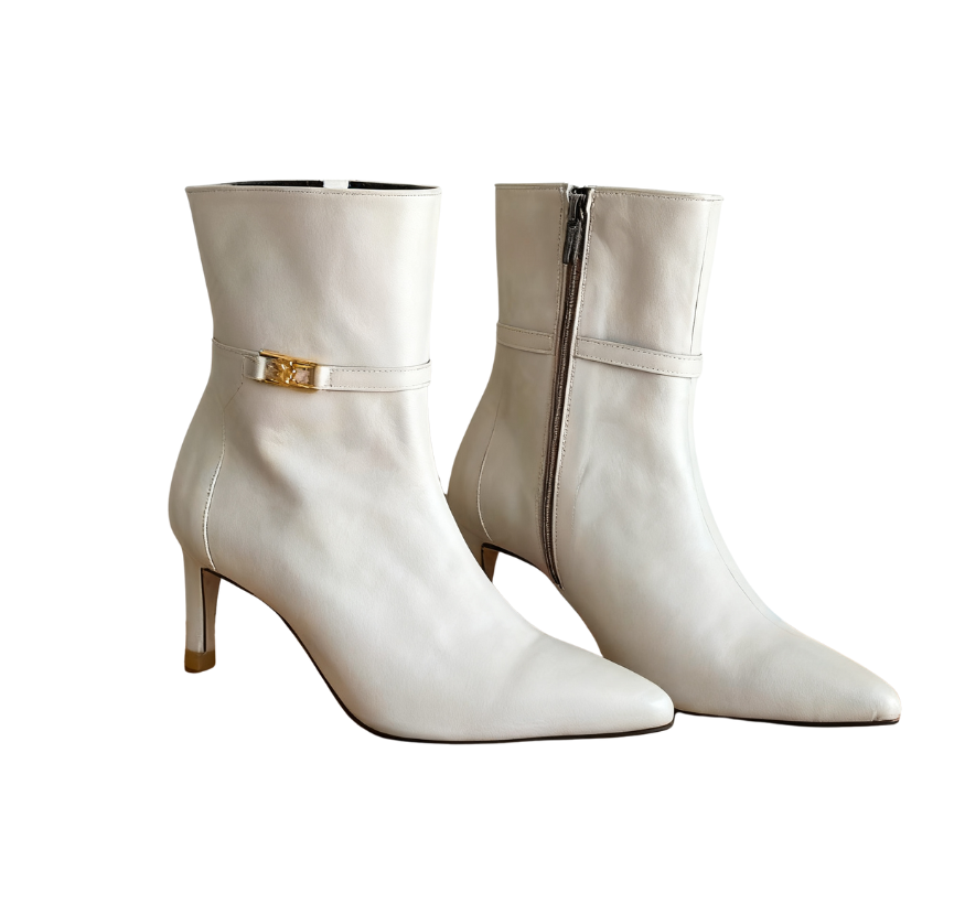 Exuding an elegant aura through exquisite craftsmanship~ The shoe body is made of high-quality leather, with a soft luster and smooth touch; the pointed-toe design修饰 the foot shape, instantly elongating the leg lines; the stiletto heel design combines stability and lightness, making every step more charming and alluring. The side of the shoe is adorned with delicate metal accessories, adding a fashionable highlight to the simple boot style, with perfect attention to detail~