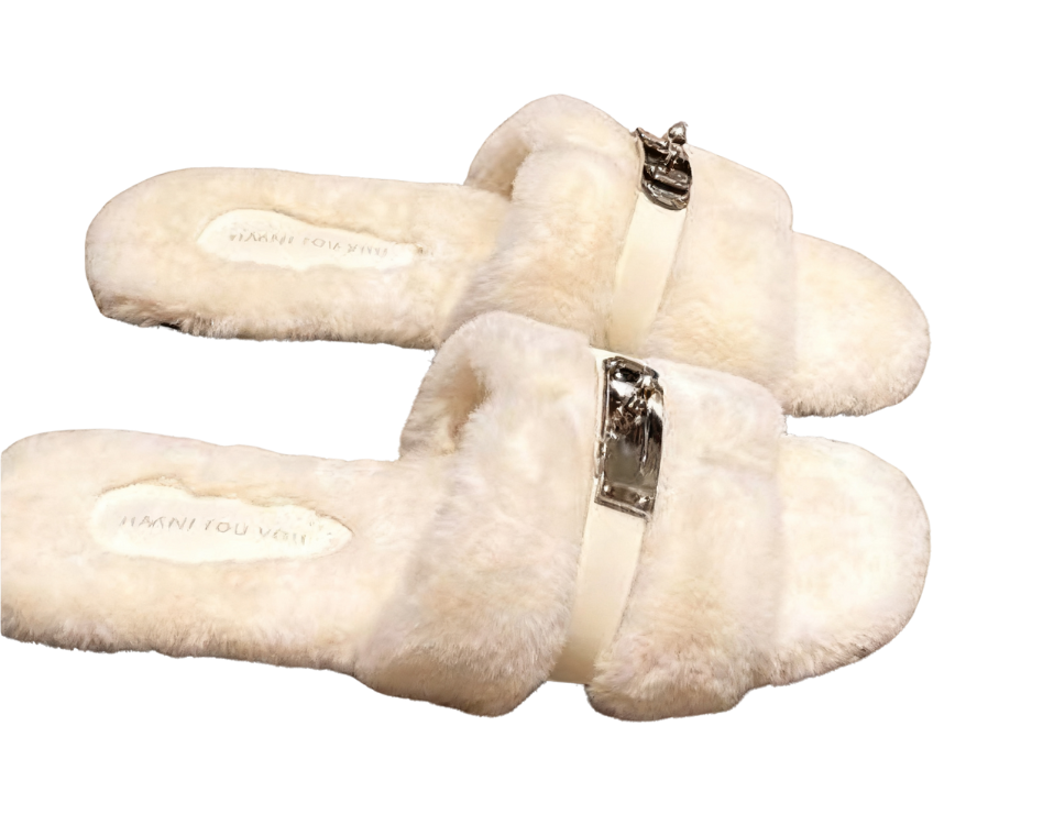Korean plush slippers are made of fluffy and soft plush fabric, with a warm and skin-friendly touch, as if gently wrapping the feet like clouds, bringing a full sense of comfort. The shoe body is decorated with exquisite metal buckles, adding a fashionable highlight to the sweet plush texture. At the same time, the clever use of leather strap splicing makes the casual atmosphere more high-end.