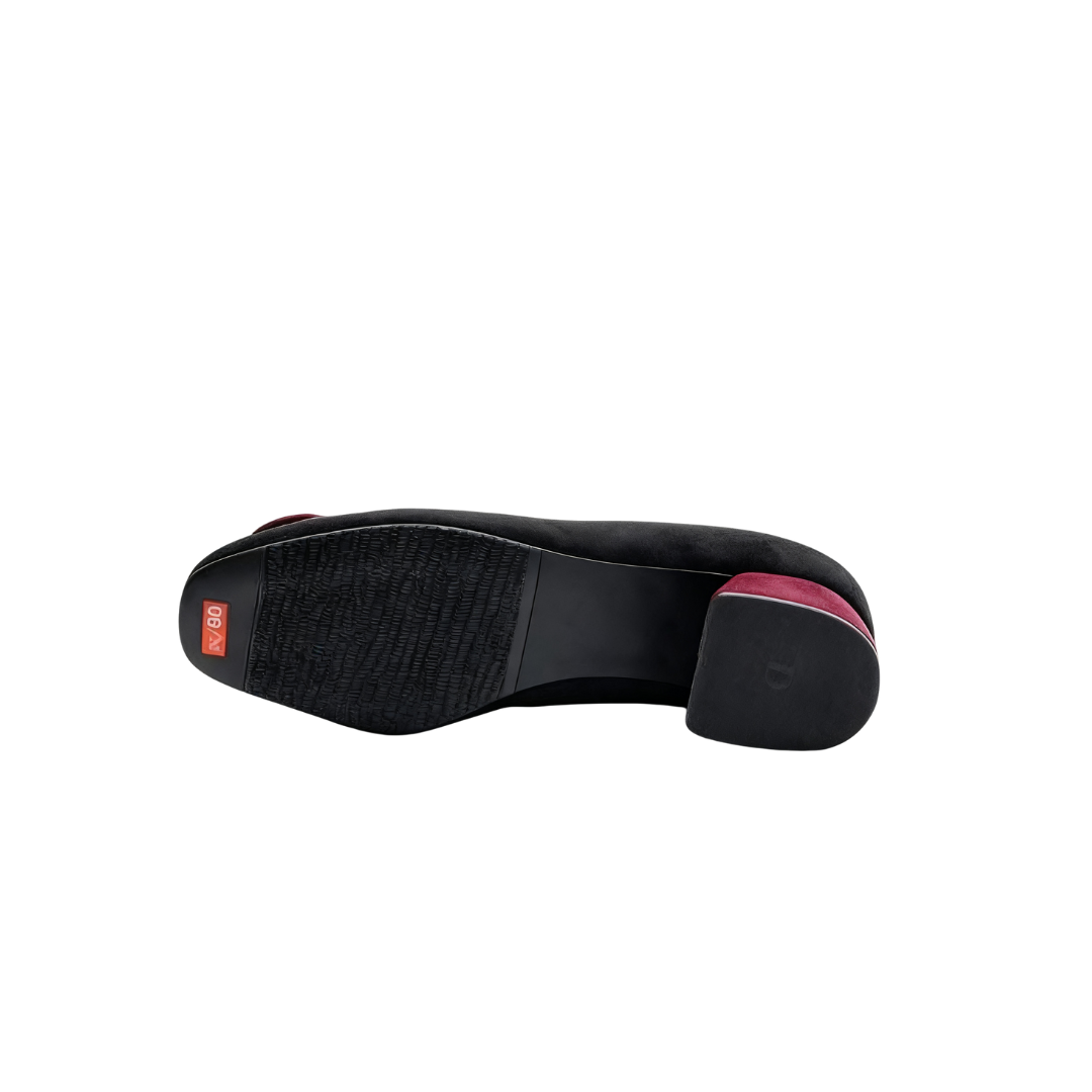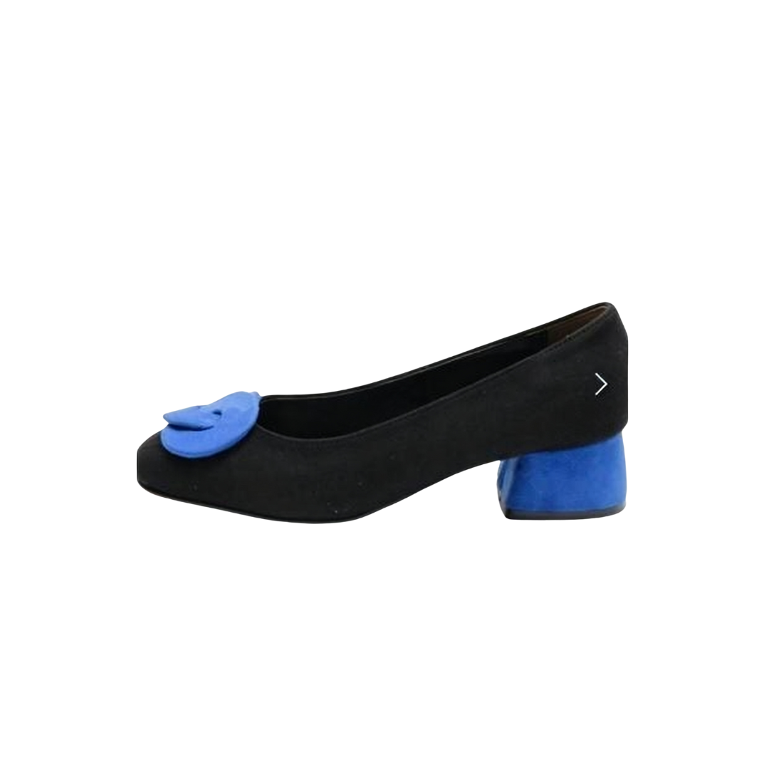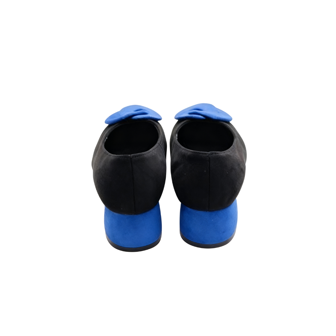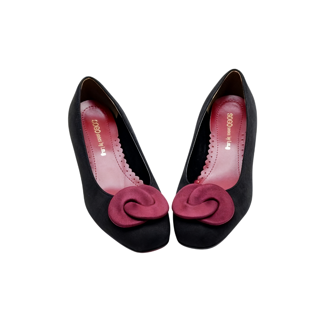 The upper is made of suede, which has a soft texture and a delicate touch. The shoe body is based on a classic black color, with a three-dimensional bow decoration on the toe, available in two color options: blue and red, adding a lively and exquisite atmosphere to the overall look. The shoe shape features a comfortable shallow mouth design, paired with a stable and easy-to-walk medium-thick heel, balancing fashionable styling and walking experience. Details such as the serrated stitching on the inner side of the shoe not only enhance the texture but also make the foot feel more fitting and comfortable. Whether for daily commuting or matching with skirts to create an elegant style, it can be easily handled. It is a Korean-style shoe that combines design sense and practicality.