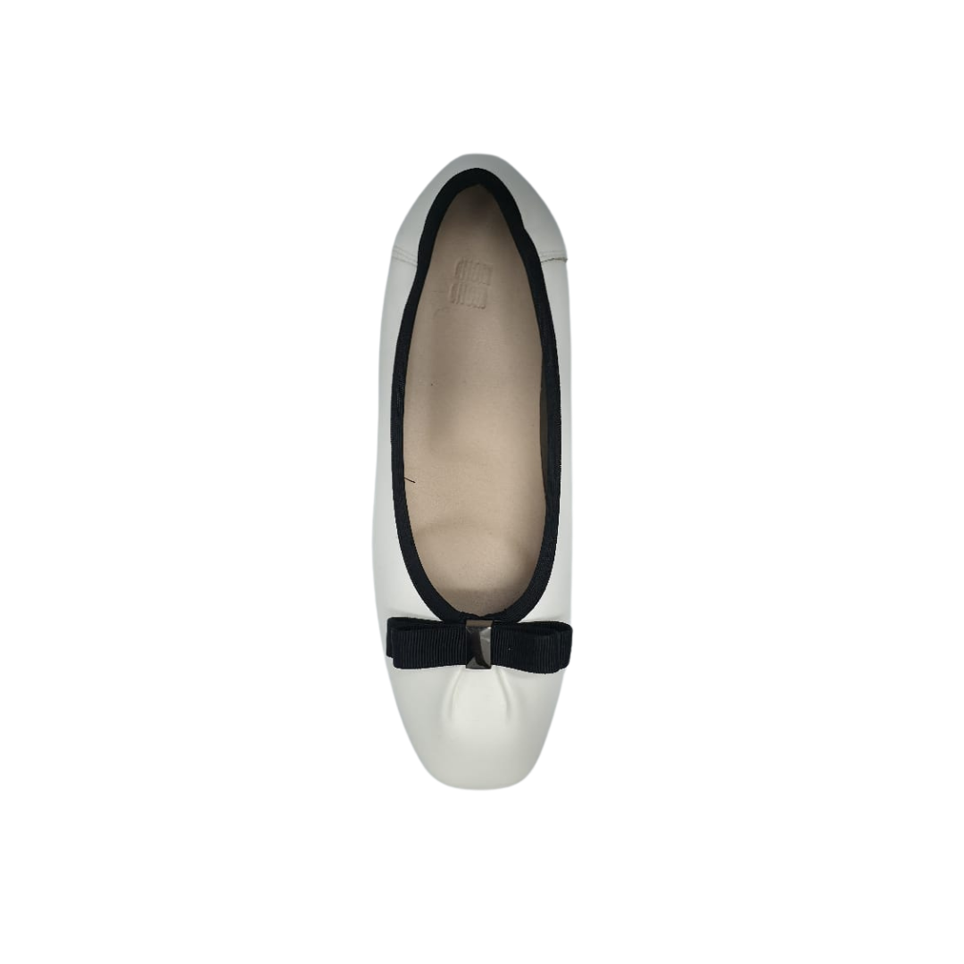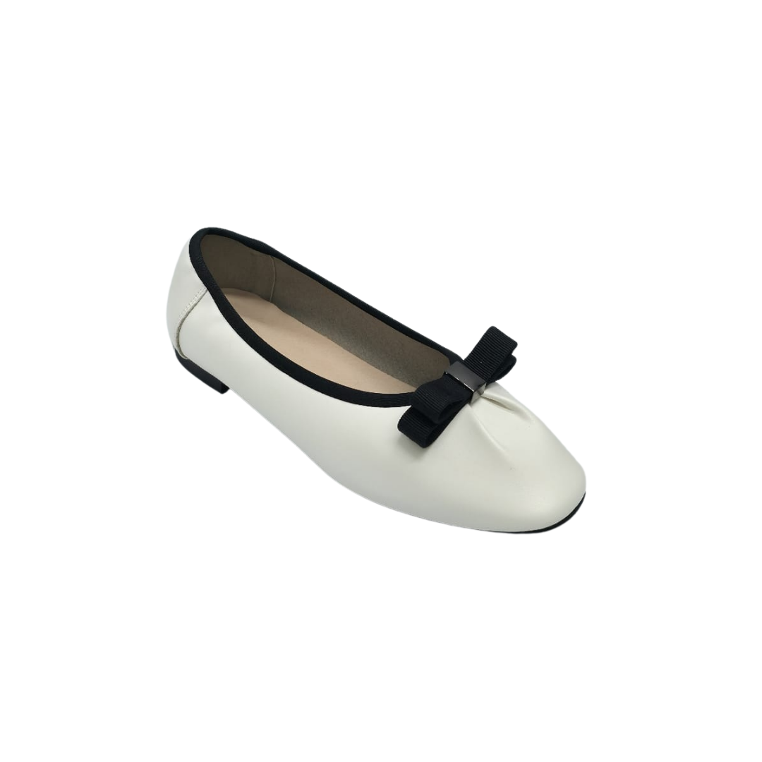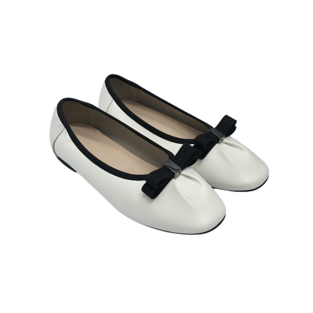 Upper part: Made of pure white leather, the texture is delicate and smooth, showing a soft luster. The toe is round-headed, with full and rounded lines, looking cute and playful. The edge of the shoe opening is decorated with black piping, which forms a sharp contrast with the white upper, adding a sense of design. There is a three-dimensional black bow decoration on the toe, and the middle of the bow is fixed with a silver metal buckle, which adorns it and makes it more exquisite.
