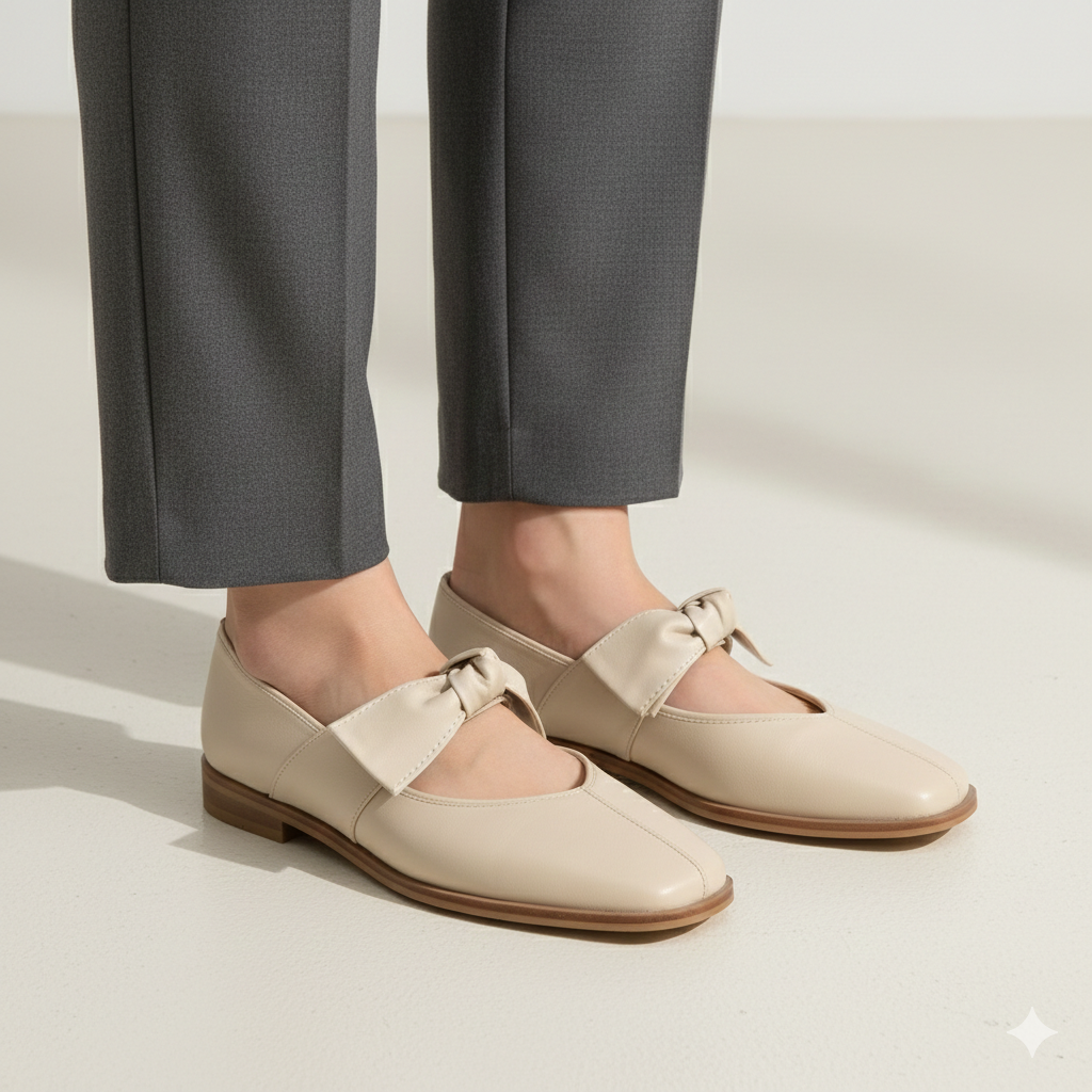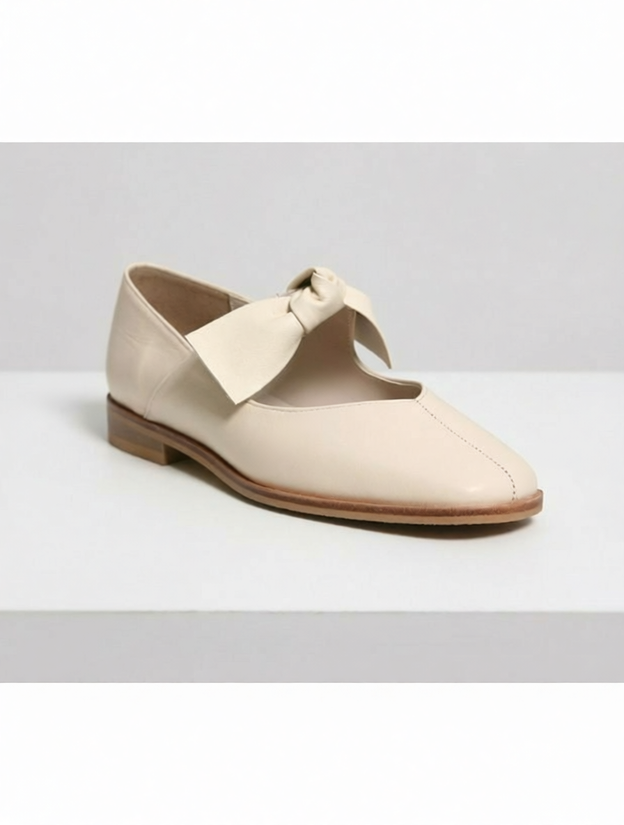 These elegant ivory flats are crafted from 100% genuine lambskin, offering a soft and premium feel. The design features a stylish square toe and a delicate ribbon bow accent on the vamp, providing a feminine and sophisticated look. Perfect for daily wear or special occasions, these shoes combine luxury material with a comfortable, classic silhouette.