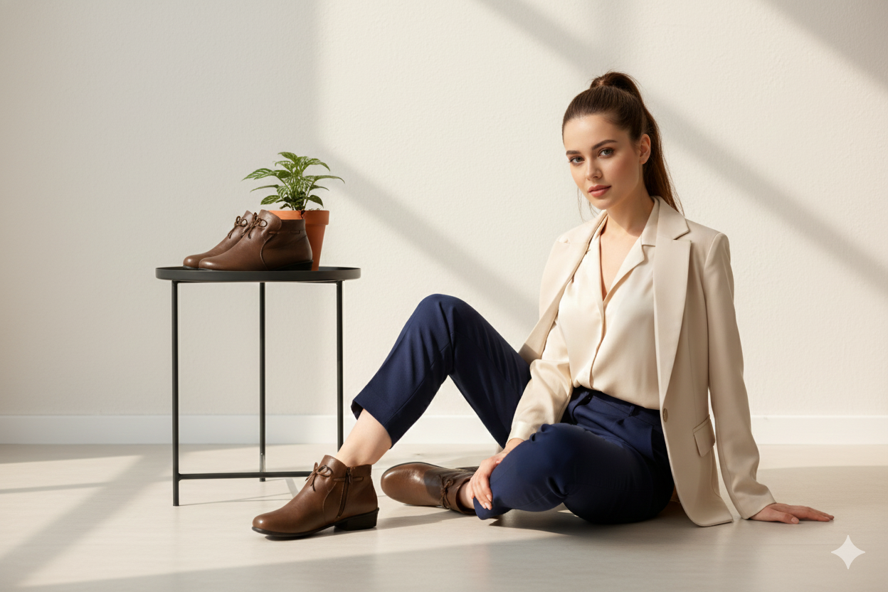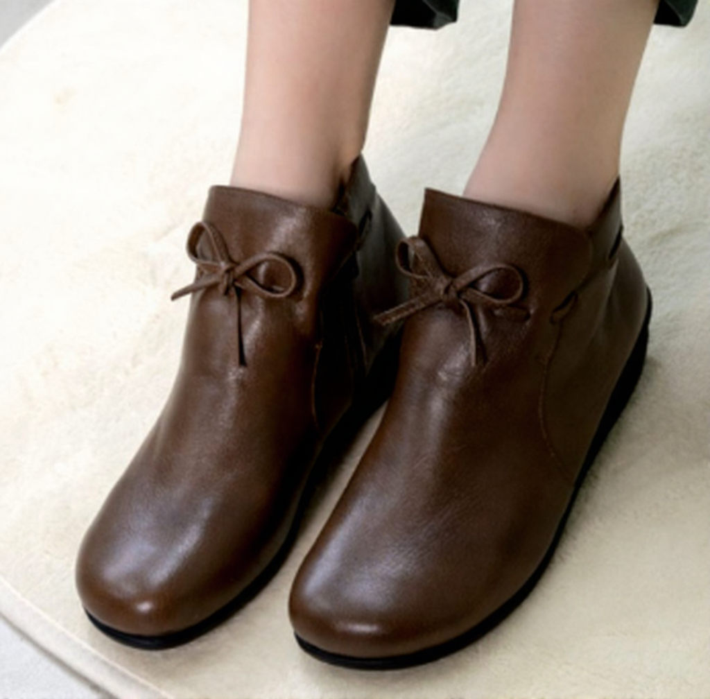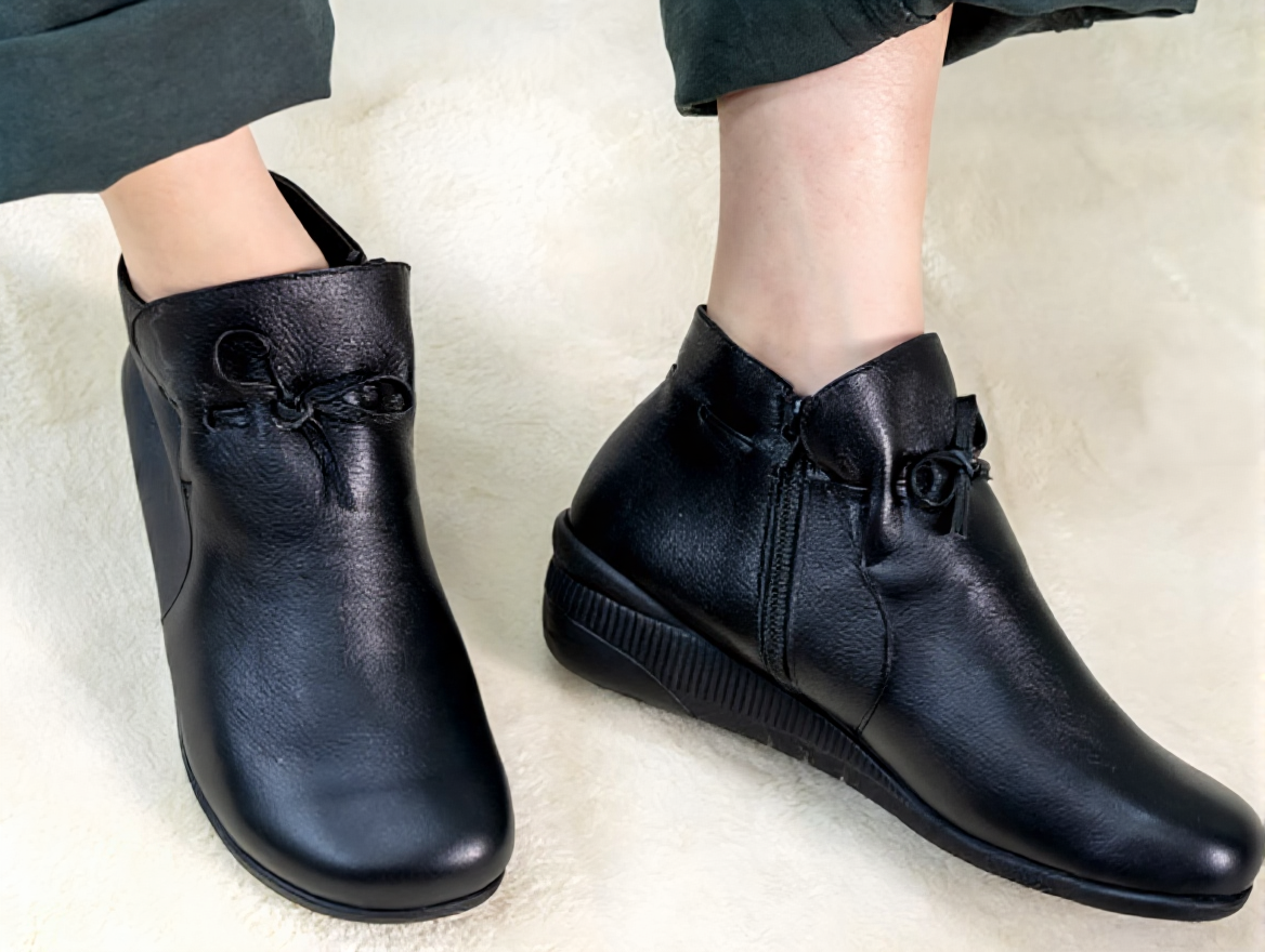 Popular ankle boots featuring a decorative ribbon accent. Designed for superior comfort with a soft cushion, allowing for long-term wear without burden. Features a convenient side zipper for easy on and off. Equipped with a non-slip outsole.