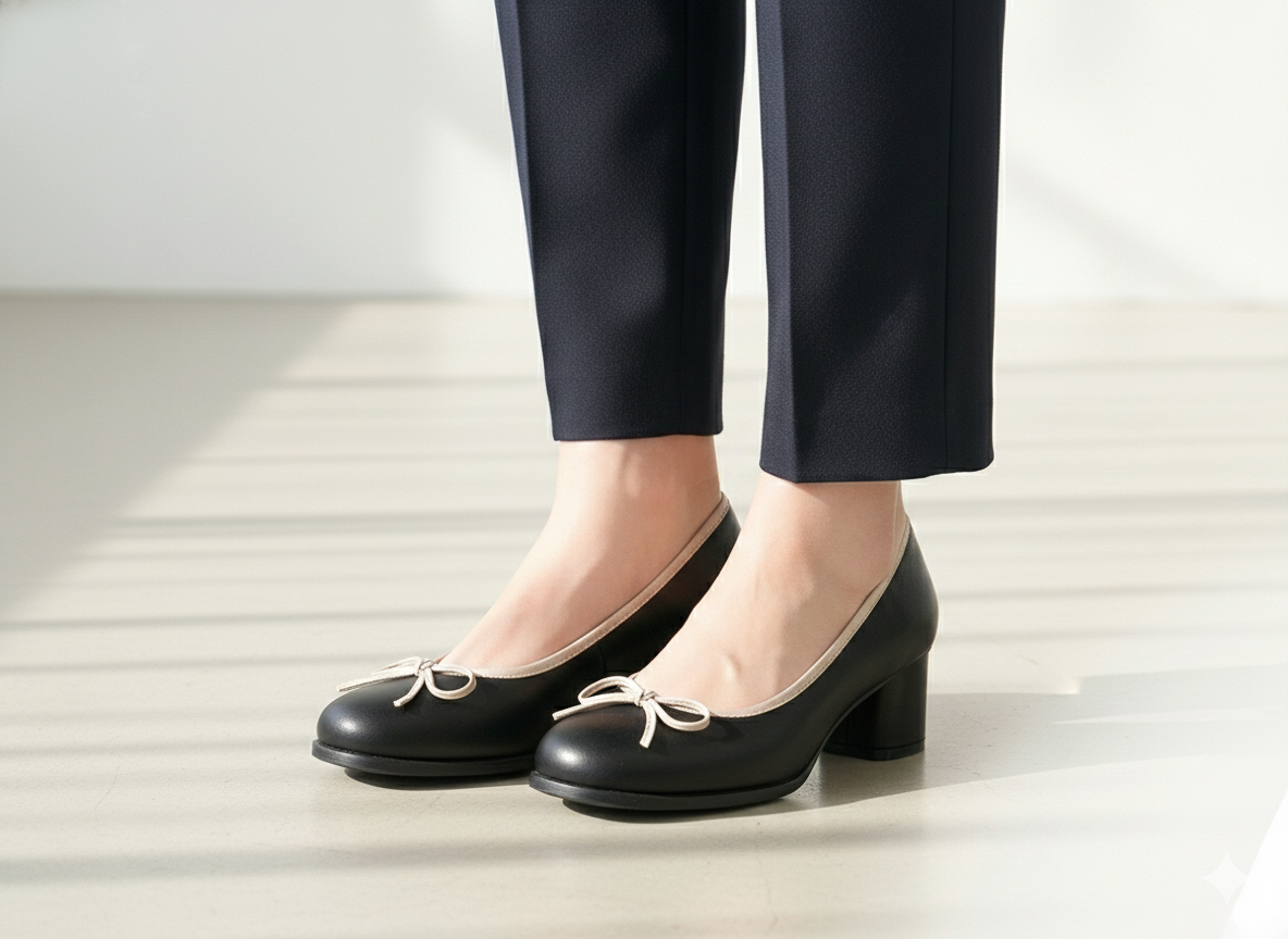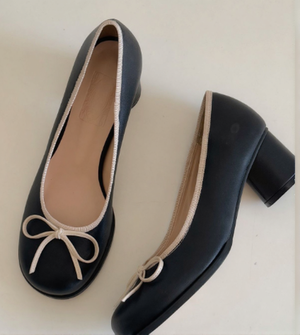 These elegant round-toe pumps feature a stylish ribbon accent on the front and a contrasting color trim. They are designed with a sturdy chunky mid-heel for added comfort and stability, making them perfect for all-day wear. Crafted from high-quality synthetic leather, these shoes offer a classic look that pairs well with denim or formal outfits.