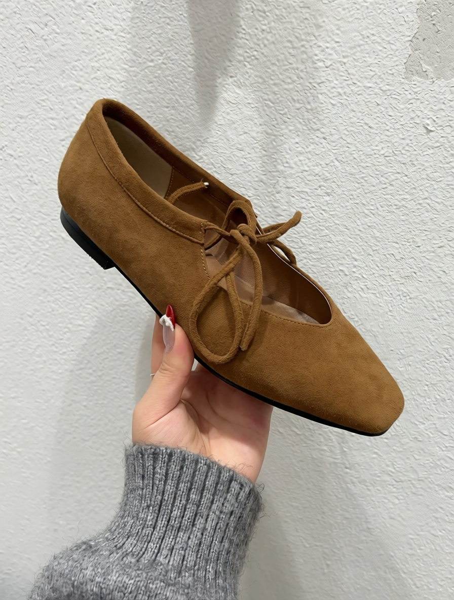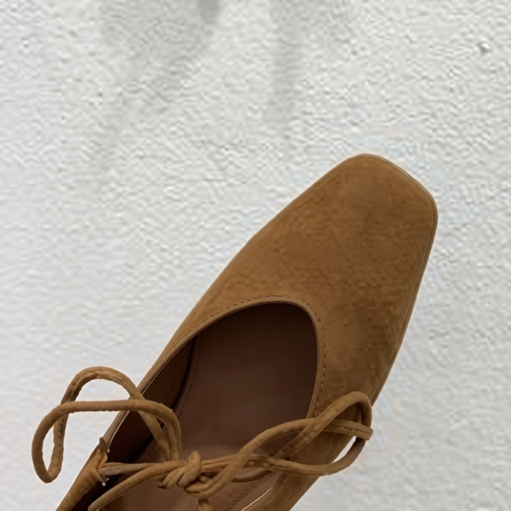These premium handmade shoes feature a sophisticated camel-toned leather finish, crafted with quality in South Korea. The elegant design includes a classic lace-up tie detail and a refined square-toe silhouette, making them a versatile choice for both professional and casual wear. The low heel provides all-day comfort while maintaining a chic, polished aesthetic.