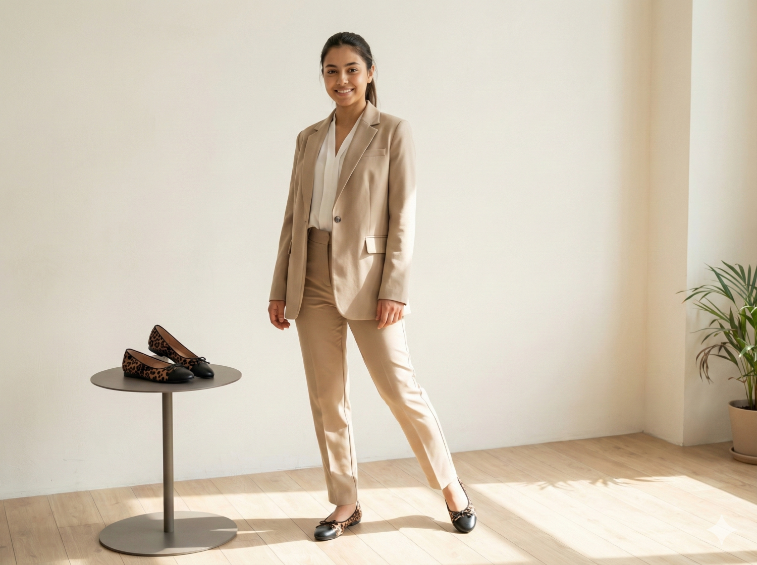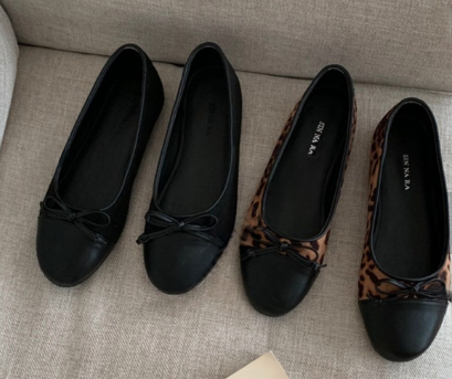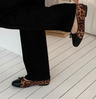 These stylish ballet flats feature a sophisticated leopard print pattern crafted from soft suede. Designed with a classic black round cap toe and a delicate bow detail for a feminine touch, these shoes offer a blend of comfort and elegance. Perfect for casual or semi-formal wear, they are expertly made in South Korea with high-quality materials to ensure durability and a refined look.
