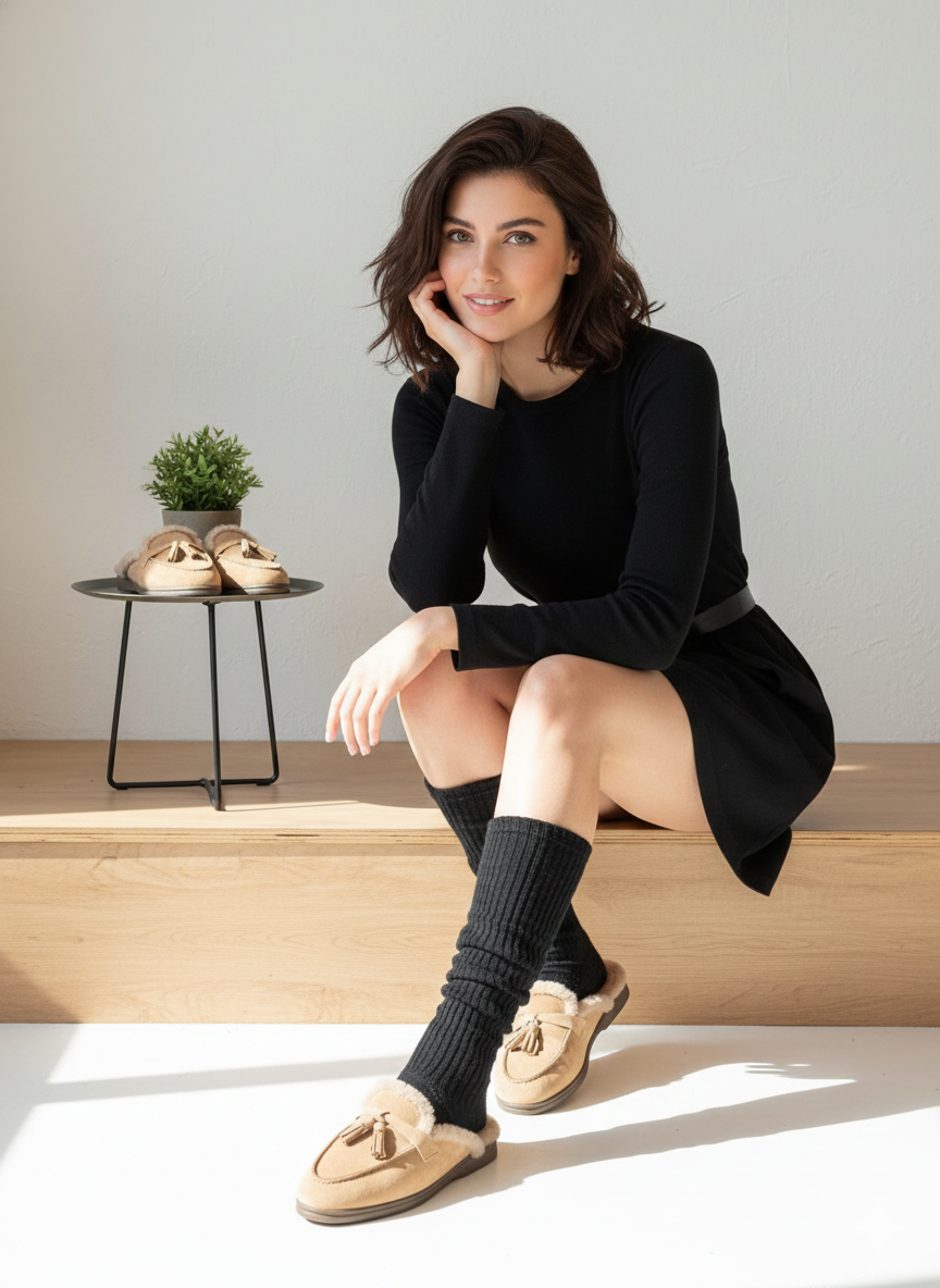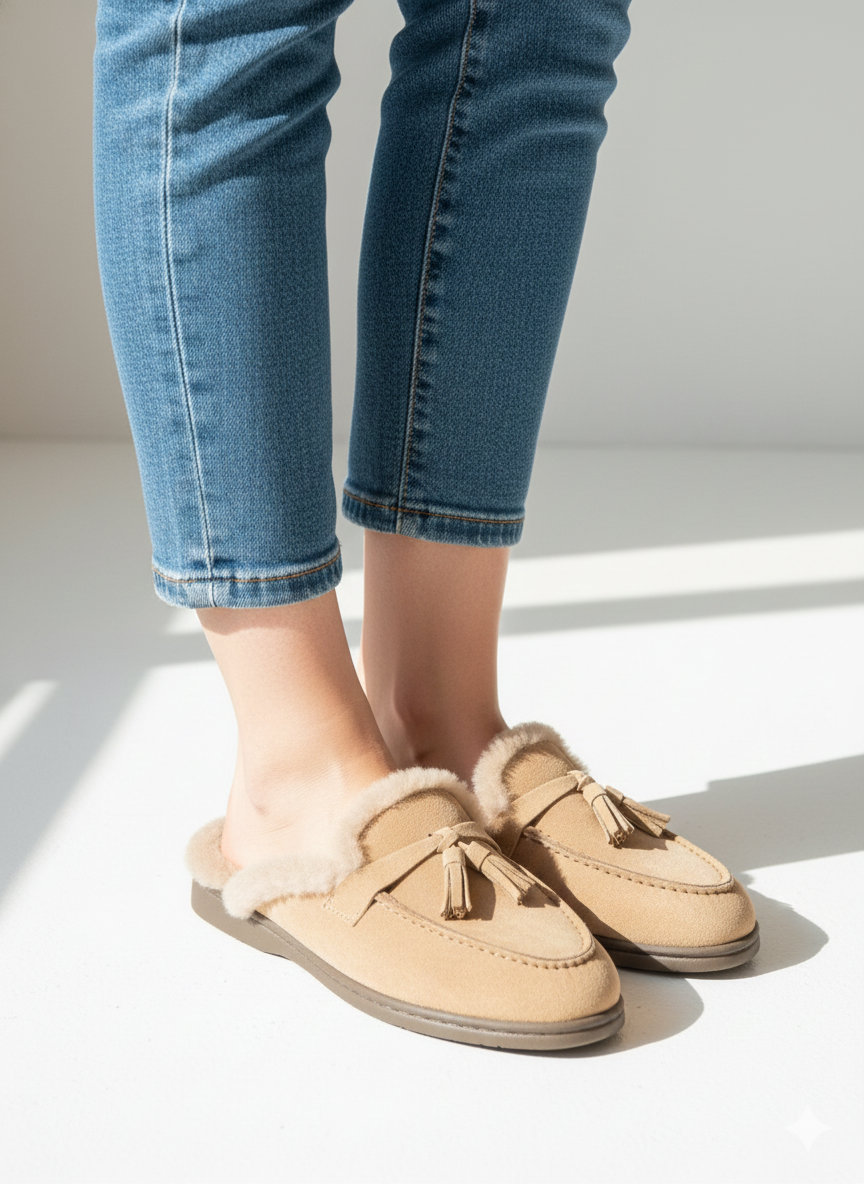 These premium South Korean-made bloafers are crafted from high-quality suede leather, featuring a sophisticated tassel embellishment on the vamp. Designed for both style and comfort, the interior is plushly lined with thick faux fur to provide exceptional warmth during the winter months. The open-back mule silhouette allows for easy slip-on wear, while the closed-toe loafer design maintains a polished aesthetic.