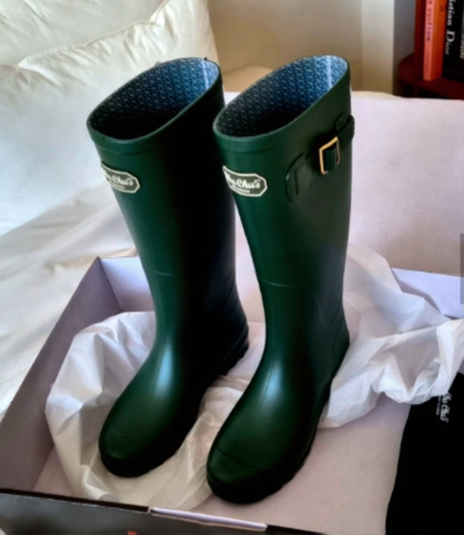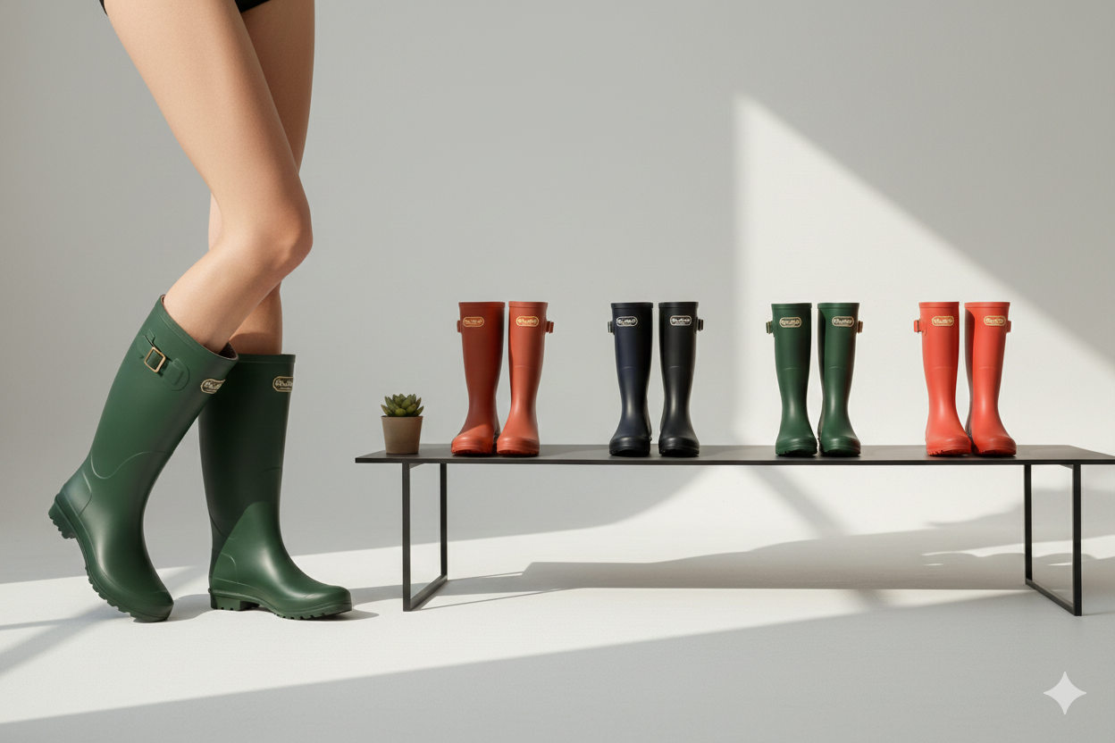 New rain boots with domestic production. Long boot style (T-3) available in Black, Green, Brown, Blue, and Orange. Features a 3 cm heel and a total length of 33 cm.