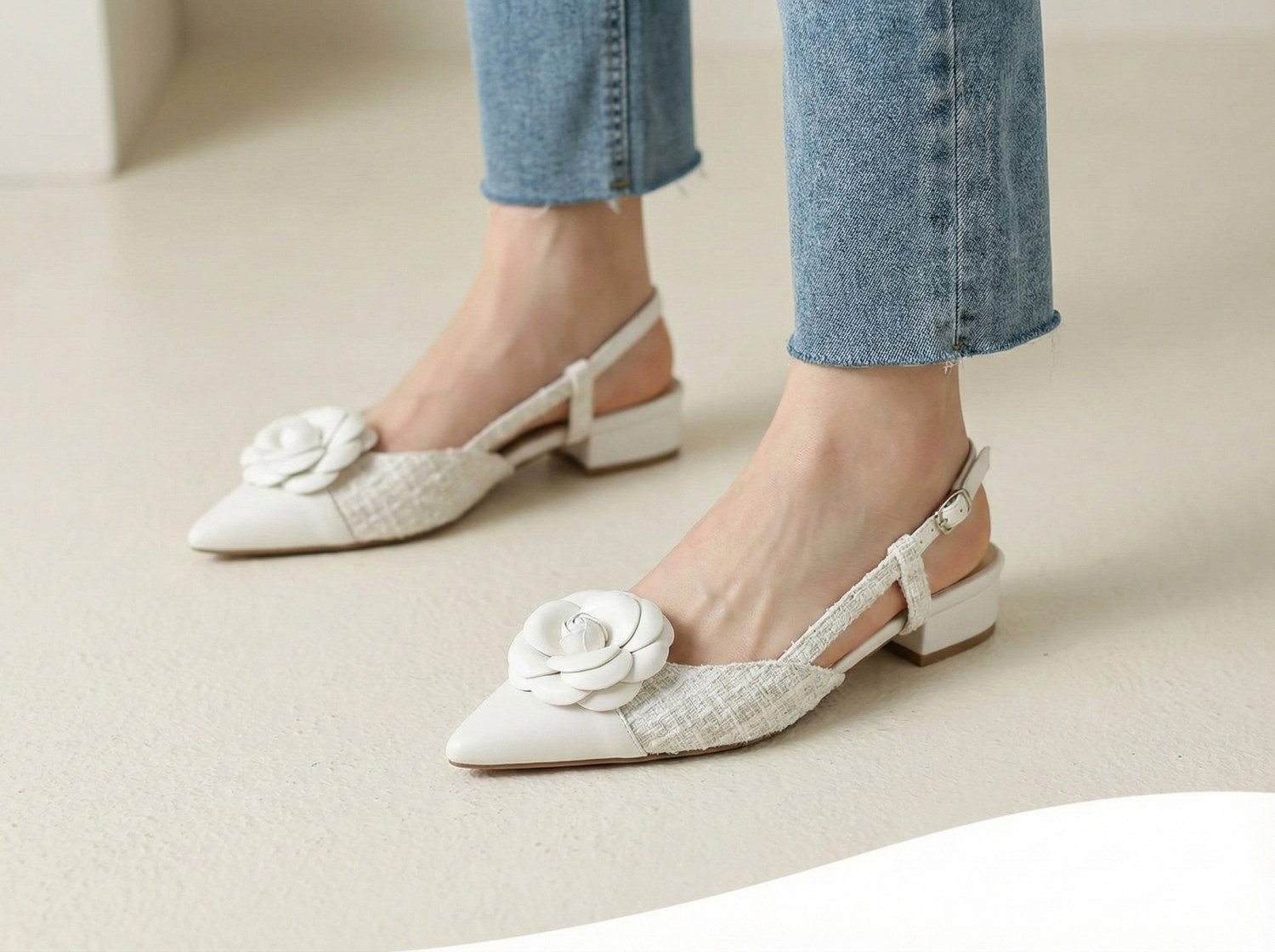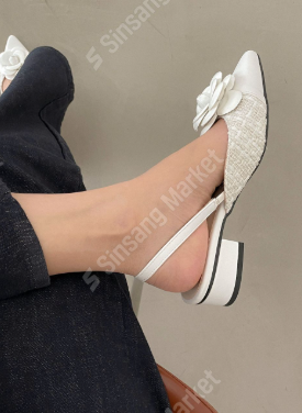 These elegant pointed-toe slingback heels feature a refined tweed fabric texture complemented by a prominent 3D camellia flower embellishment. Designed and manufactured in South Korea, these shoes offer a sophisticated, feminine aesthetic perfect for professional settings or special occasions. The low, sturdy block heel ensures comfortable all-day wear while maintaining a polished silhouette.