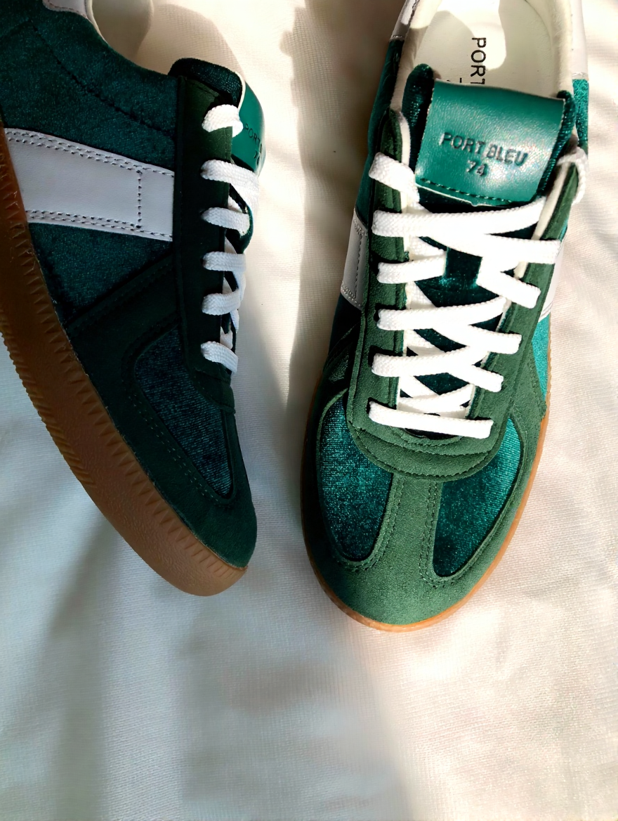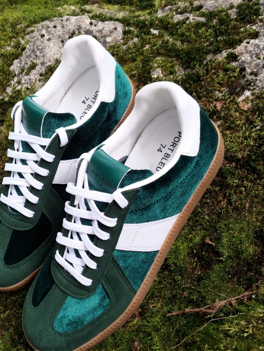 These sneakers feature a classic German Army Trainer (GAT) silhouette, reimagined with a luxurious dark green velvet upper and premium leather overlays. Designed for both men and women, they offer a vintage athletic aesthetic with a durable gum rubber sole and high-quality handmade construction. The interior is lined for comfort, making them suitable for everyday wear.